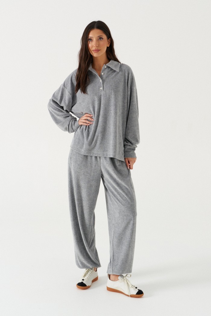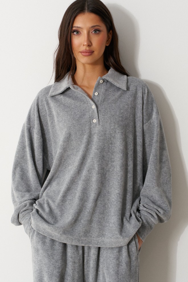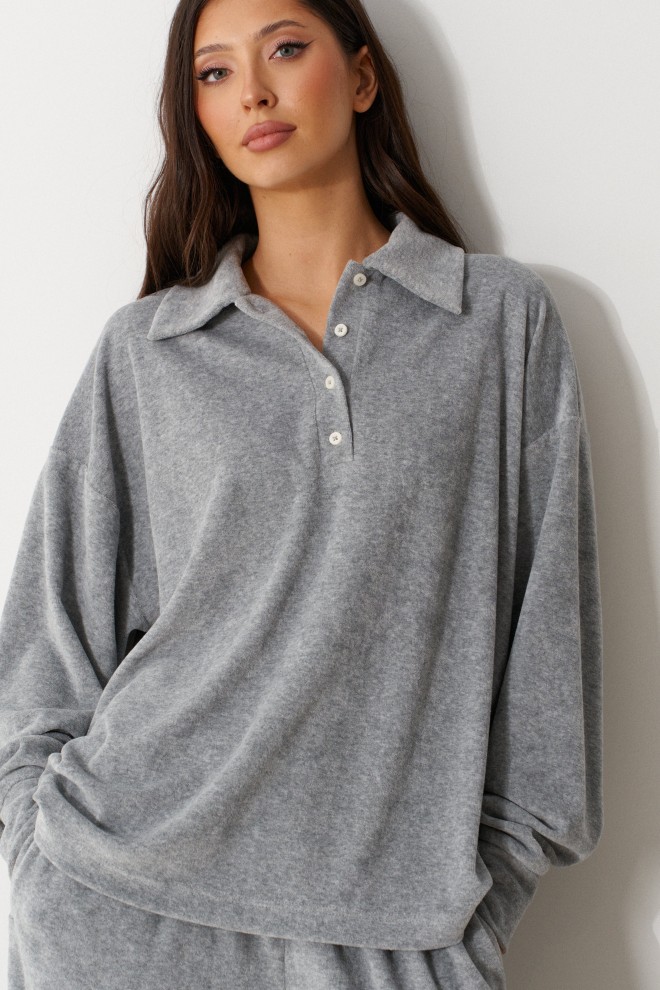 Джемпер прямого кроя выполнен из трикотажного полотна серого цвета. Характеристики: горловина круглая с отложным воротником и планкой-ПОЛО, застегивающейся на пробивные петли и пришивные пуговицы, линия плеча спущенная, рукав втачной с притачной манжетой по низу. Длина рукава 58см, длина изделия 67см.