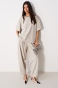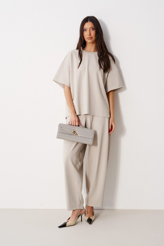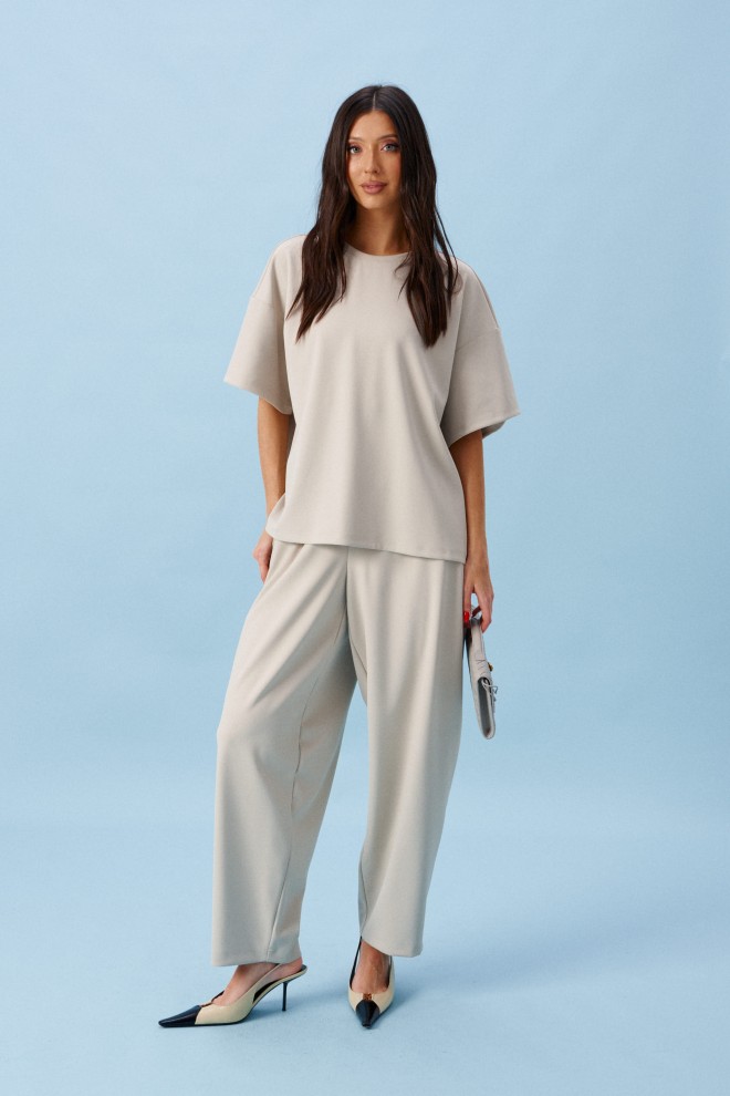 Футболка прямого кроя, выполнена из трикотажного полотна. Характеристика: прямой свободный крой, горловина овальная, рукав втачной, спущенный. Длина по центру спинки от края горловины 64 см, длина рукава от горловины 40 см.
