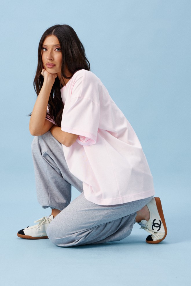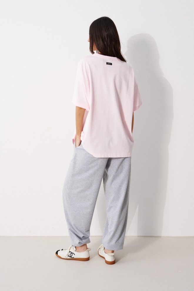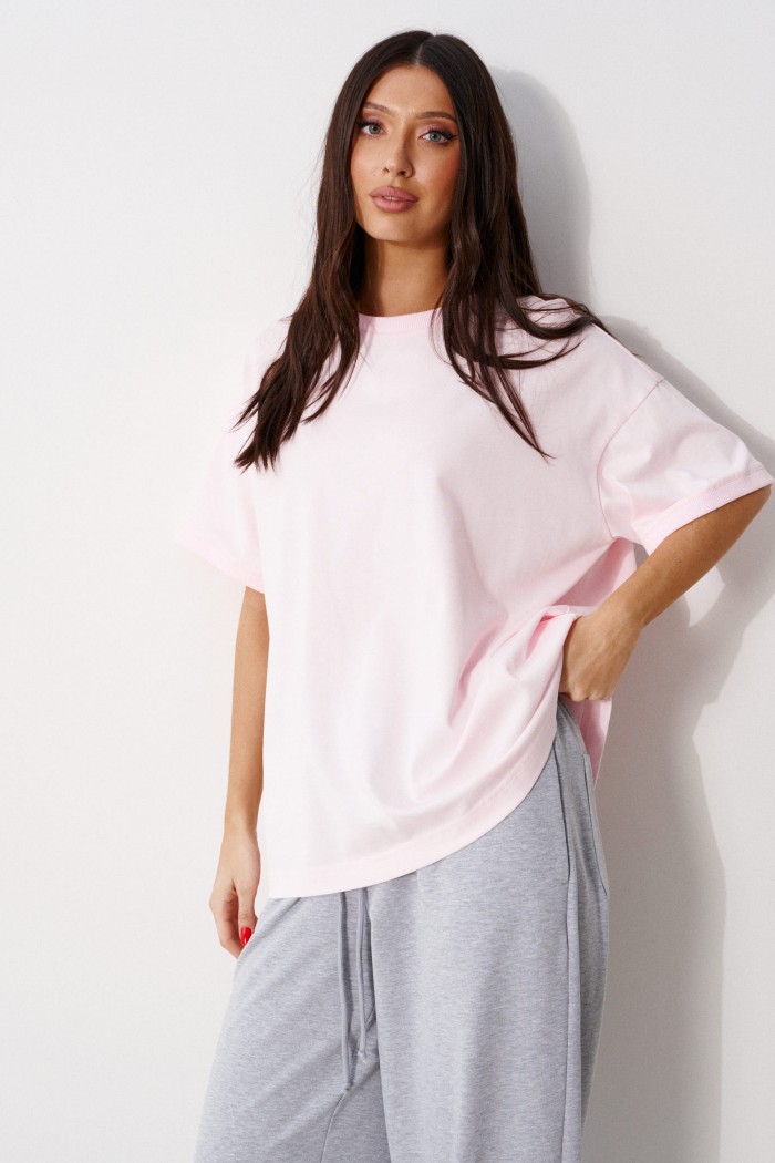 Футболка прямого свободного кроя, выполнена из трикотажного полотна розового цвета. Характеристика: прямой крой, овальная горловина выполнена из довяза, рукав вточной спущенный, край выполнен из довяза, спинка цельнокраеная, на спинке под горловиной брендированная нашивка "ANNETE". Длина по спинке 68см, длина рукава от края горловины 40см.