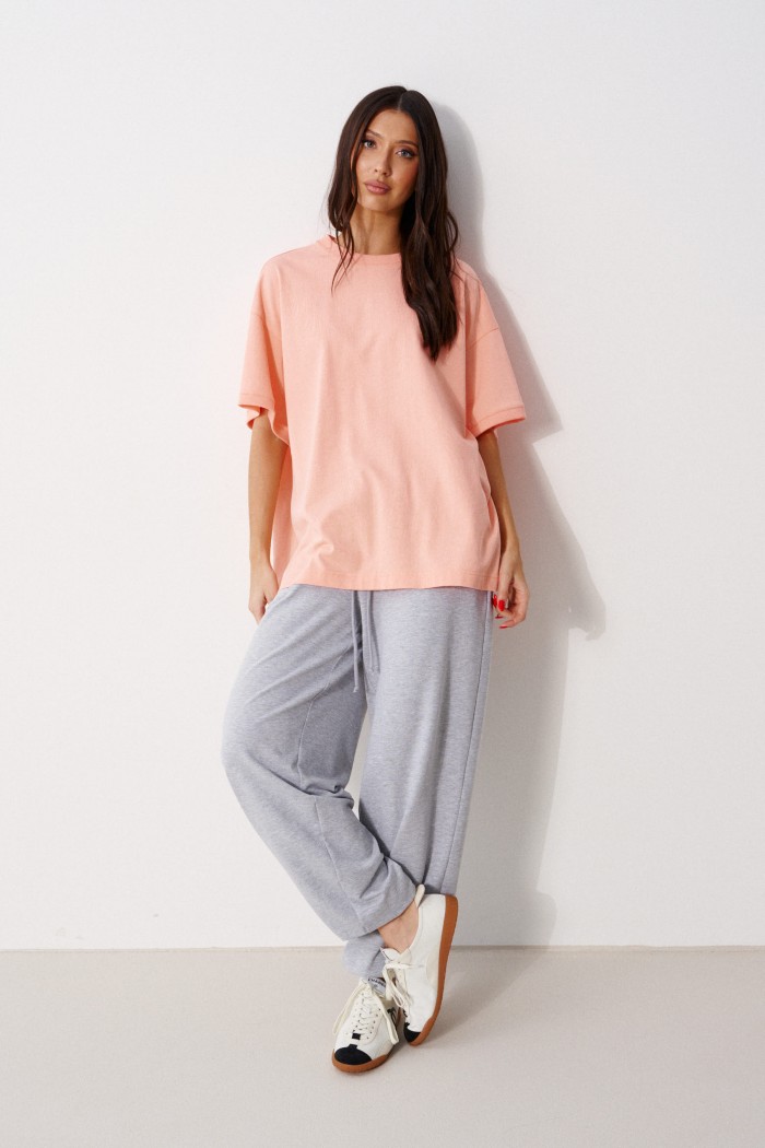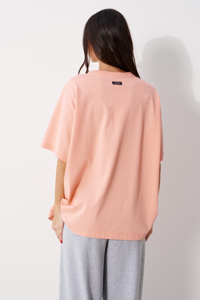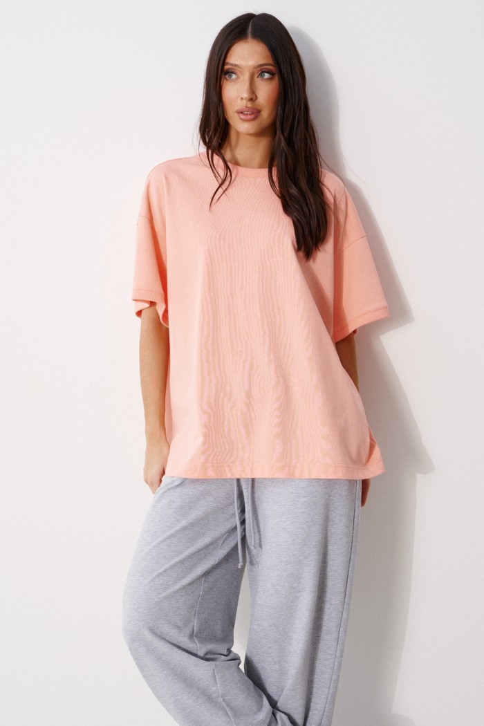 Футболка прямого свободного кроя, выполнена из трикотажного полотна персикового цвета. Характеристика: прямой крой, овальная горловина выполнена из довяза, рукав вточной спущенный, край выполнен из довяза, спинка цельнокраеная, на спинке под горловиной брендированная нашивка "ANNETE". Длина по спинке 68см, длина рукава от края горловины 40см.