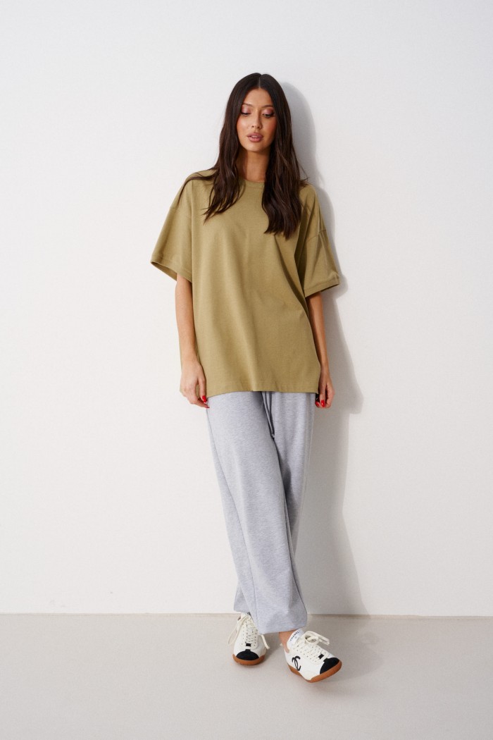 Футболка прямого свободного кроя, выполнена из трикотажного полотна оливкого цвета. Характеристика: прямой крой, овальная горловина выполнена из довяза, рукав вточной спущенный, край выполнен из довяза, спинка цельнокраеная, на спинке под горловиной брендированная нашивка "ANNETE". Длина по спинке 68см, длина рукава от края горловины 40см.