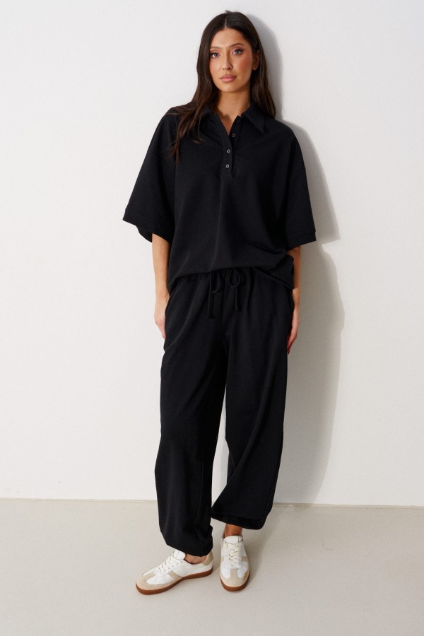 Джемпер-поло прямого, свободного кроя. Выполнен из трикотажа двухнитки в черном цвете. Воротник отложной. Застёжка петли пуговицы на планке. Рукав втачной, спущен. Длина спинки 68 см. Длина рукава от горловины 47 см