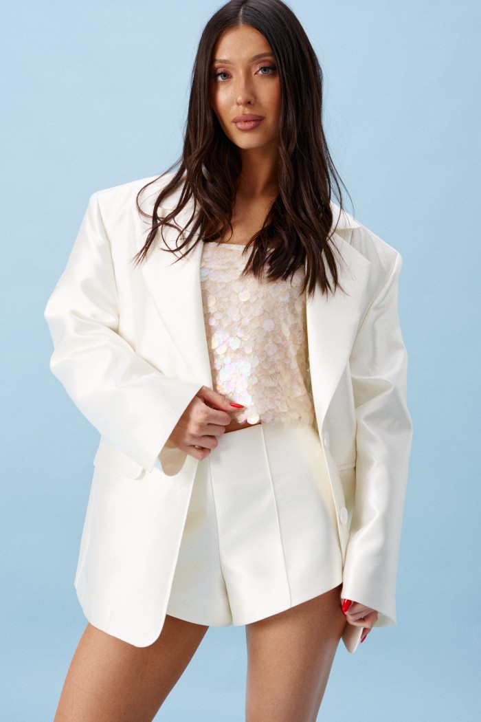 Топ свободного кроя. Выполнен из ткани с пайетками. С подкладкой. Верх на резинке. Длина 24 см