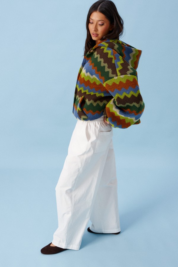 Топ прилегающего силуэта. Выполнен из мягкой трикотажной ткани тёплого белого цвета. Вырез горловины V-образный. По линии выреза горловины и по спинке кружево, переходящее в бретели. Длина спинки 35 см
