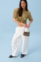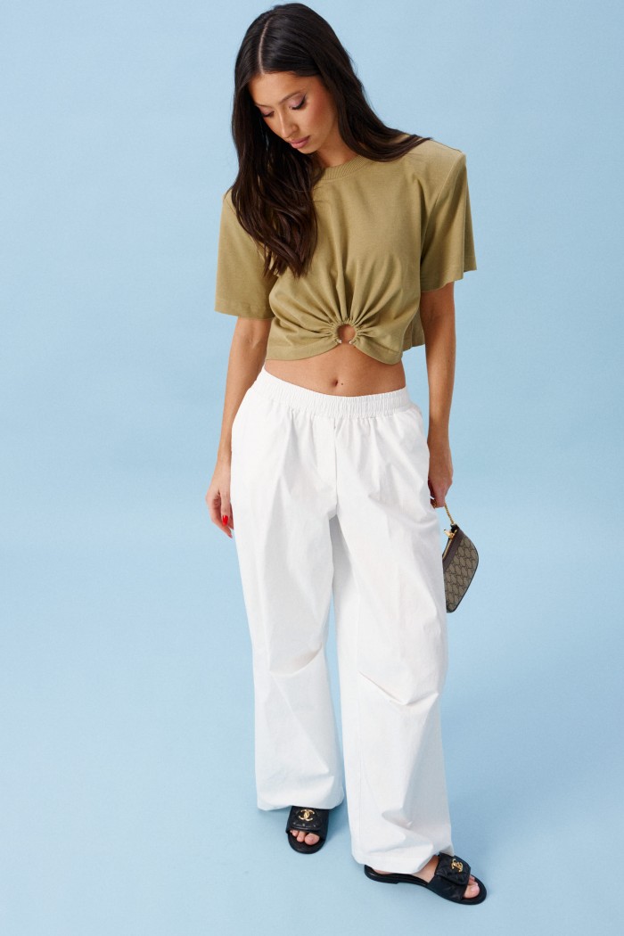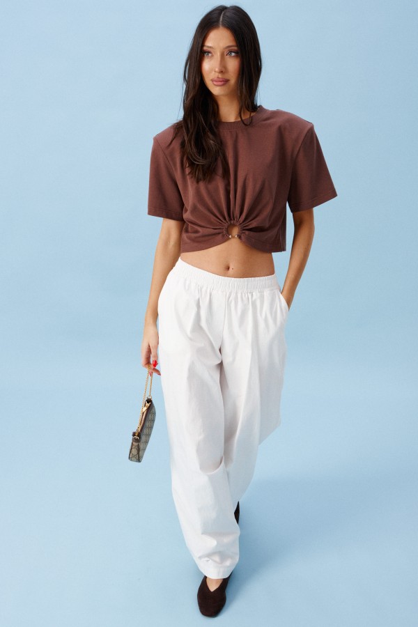 Футболка прямого кроя, выполнена из хлопкового полотна. Характеристика: укороченая, прямой свободный крой, горловина овальная, рукав слегка спущен, подплечники, спереди декоративная сборка на элемент-полукольцо . Длина по центру спинки от края горловины 40 см, длина рукава от края горловины 39 см.