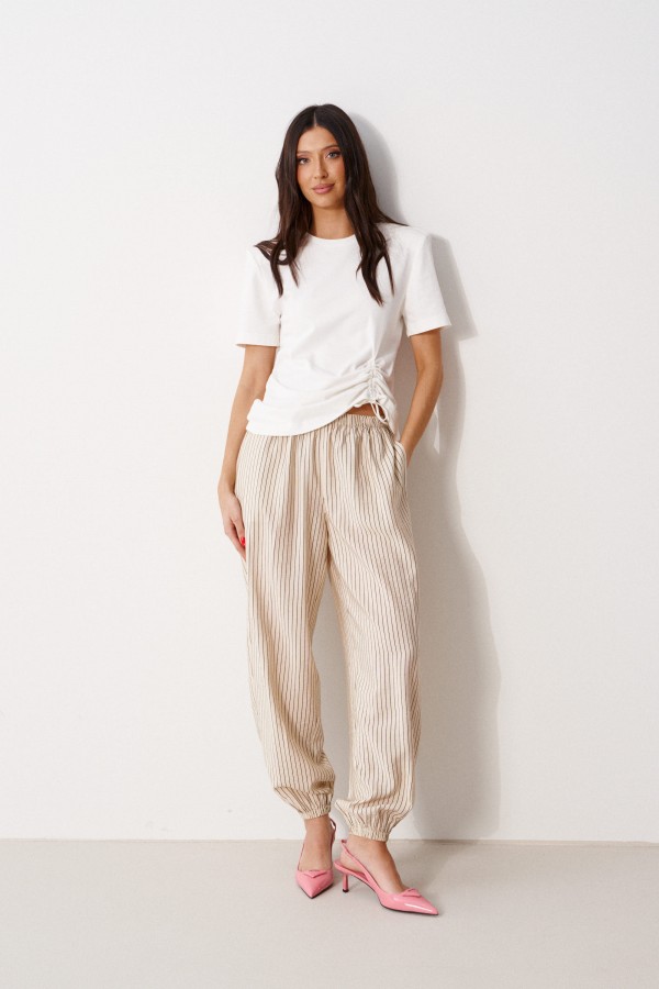 Джемпер прямого кроя с подплечниками. Выполнен из мягкого трикотажа светлого цвета. Без подкладки. По переду джемпера стяжка. Длина спинки 65 см