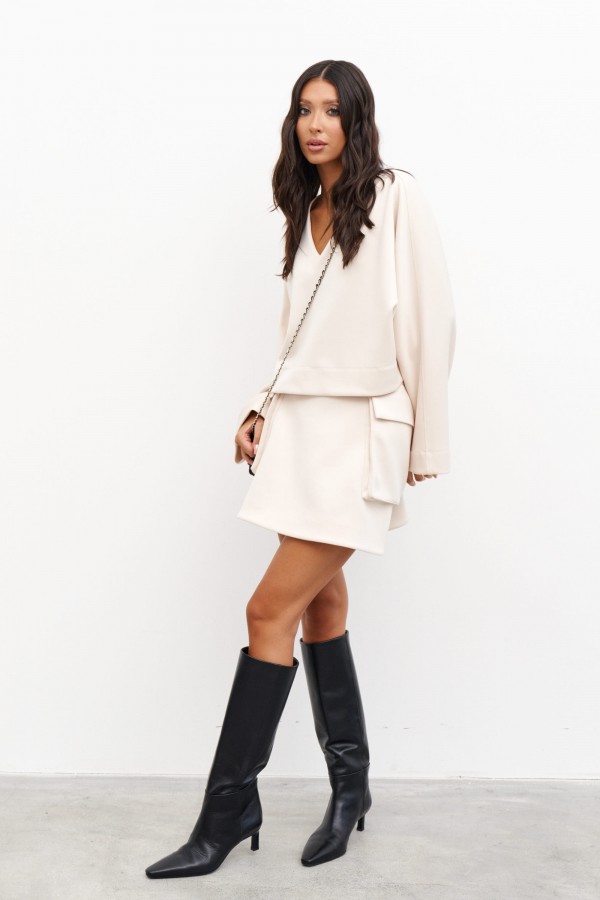 Джемпер прямого свободного кроя. Выполнен из мягкой ткани неопрен. Силуэт прямой, вырез горловины V-образный, подгиб изделия и подгиб рукава широкие. Рукав цельнокроеный, длина 78 см. Длина спинки джемпера 47 см.