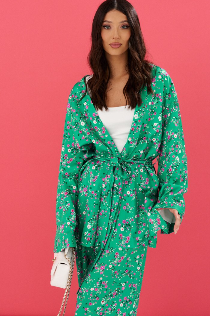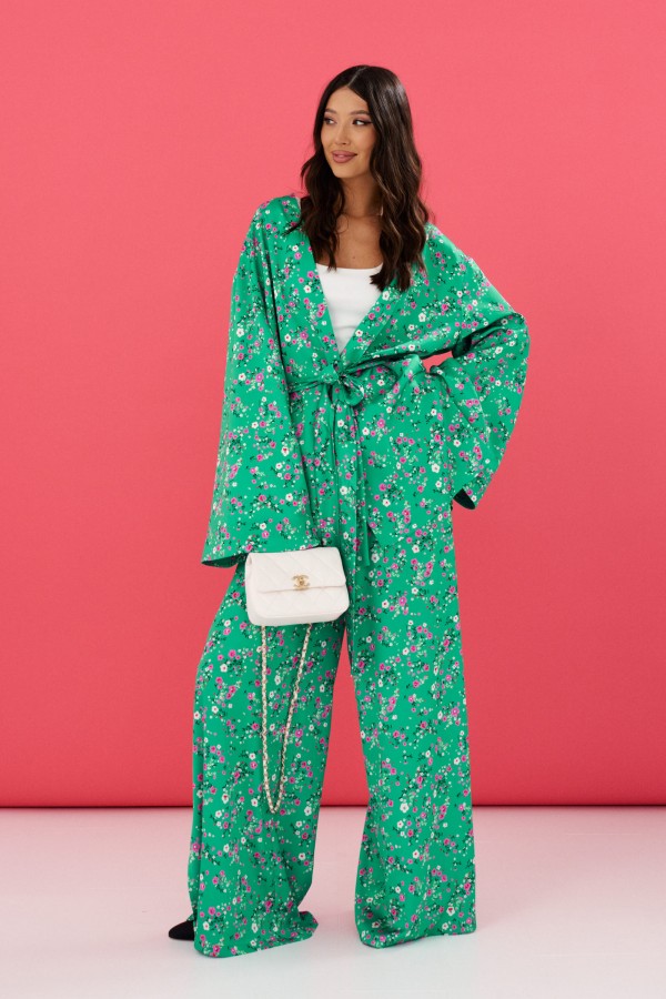 Туника свободного кроя выполнена из зеленого полотна с ярким цветочным принтом.
