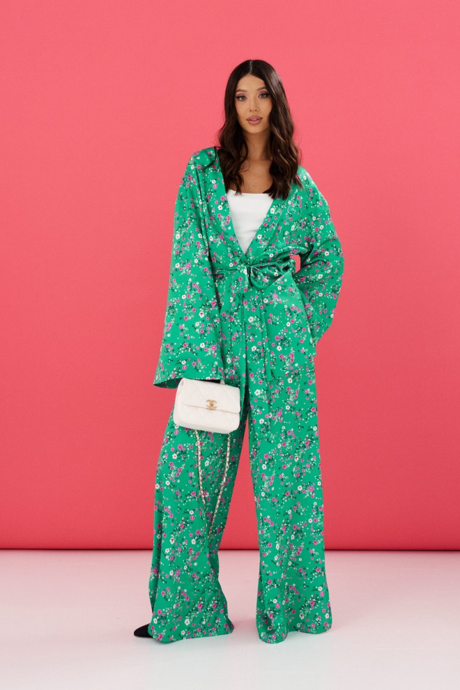 Характеристики: прямой свободный крой, подкладка, на запах, по линии талии нашиты шлевки , в комплекте пояс из ткани основного изделия, рукав свободного кроя с разведением к низу, спущен.