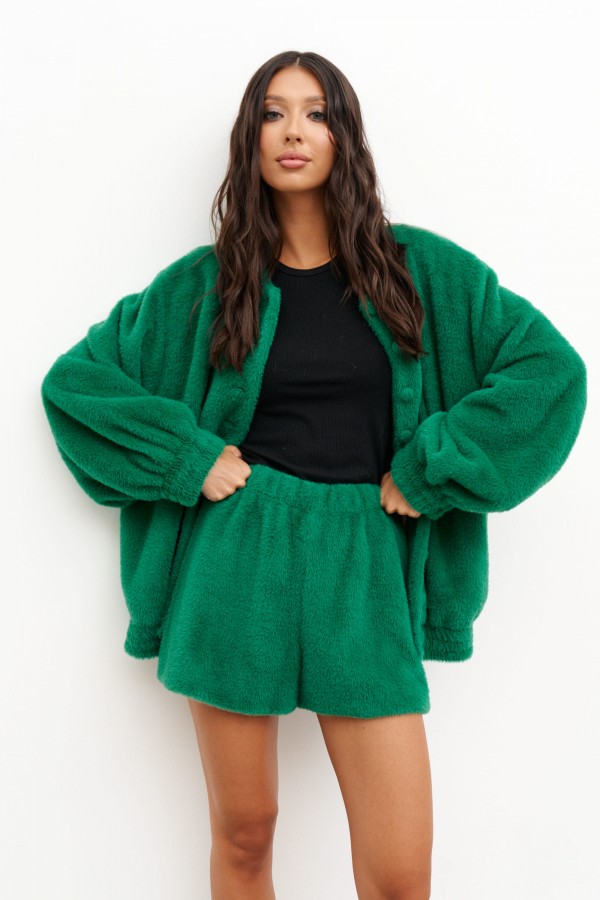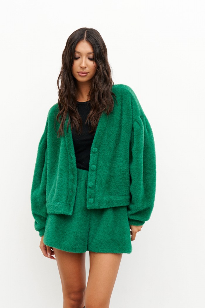 Кардиган свободного кроя выполнен из мягкого фактурного полотна бежевого цвета. Характеристики: свободный крой, горловина V образный вырез, застежка центральная петли пуговицы декорированые тканью основного изделия, рукав объёмный, спущен, по низу рукава манжета. Длина изделия 51 см , длина рукава 71 см от края горловины.