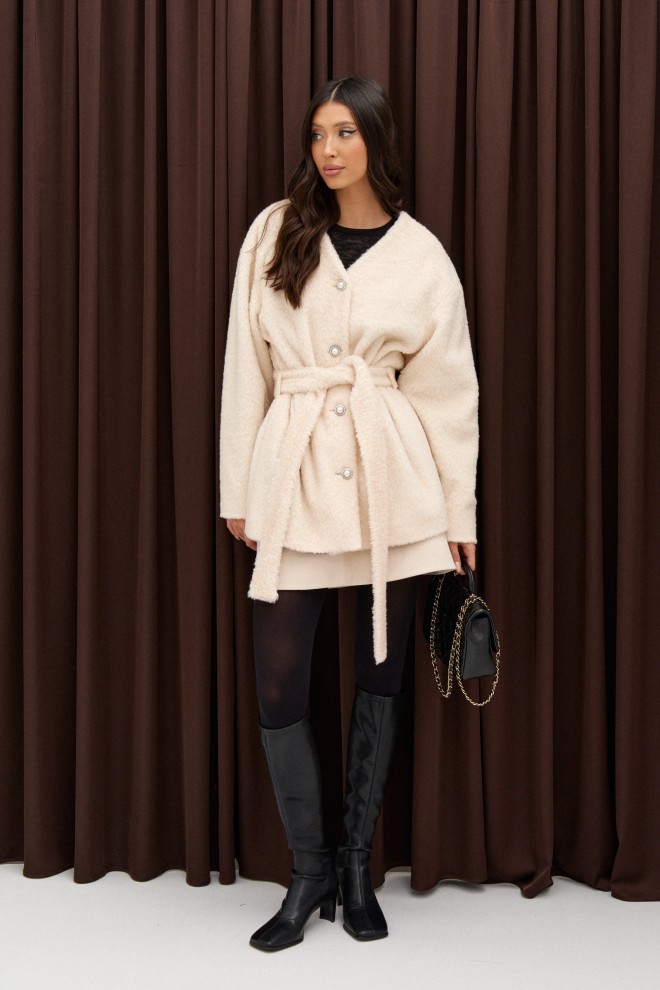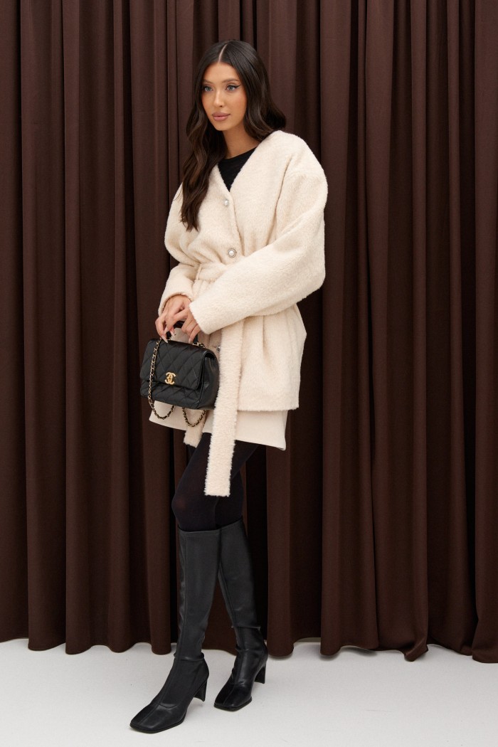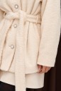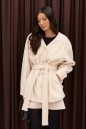 Кардиган прямого кроя выполнен из фактурной ткани молочного цвета. Характеристики: прямой крой, подкладка, V-образный вырез на центральную застежку - петли пуковицы, рукав объемный заужен к низу, по линии талии на боковых швах шлевки, в комплекте пояс из ткани основного изделия, спинка цельнокроеная. Длина изделия 76 см, длина рукава от края горловины 75 см.