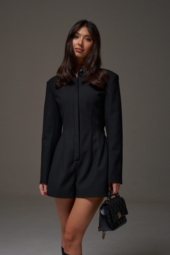 Комбинезон полуприлегающего силуэта, выполнен из костюмной ткани черного цвета. Характеристики: воротник отложной, двойные выточки по талии, по спинке на талии изделие присборено на резинку, рукав втачной, на брендированной подкладке, застёжка центральная - потайная планка с пуговичками. Длина рукава от линии втачивания 63 см, длина изделия по спинке 81 см.