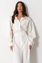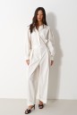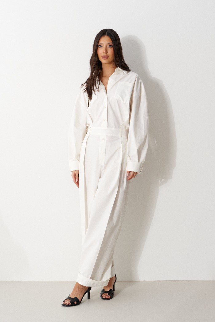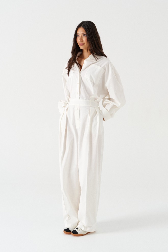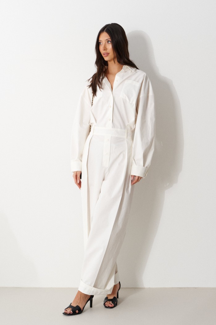 Комбинезон свободного кроя. Выполнен из хлопковой ткани молочного (тёплого белого) цвета. Без подкладки. Воротник отложной. Застёжка центральная - пуговицы. На уровне линии груди накладные карманы. Рукав втачной, спущенный, с манжетом с пуговицей. Пояс частично на резинке (резинка по задней части), со шлёвками. Брюки по переду со складками. По переду имитация застёжки. В боковых швах карманы. Длина рукава от линии втачивания 60 см. Длина спинки (до пояса) верха 48 см. Длина брючины по боковому шву (с учётом пояса) 110 см