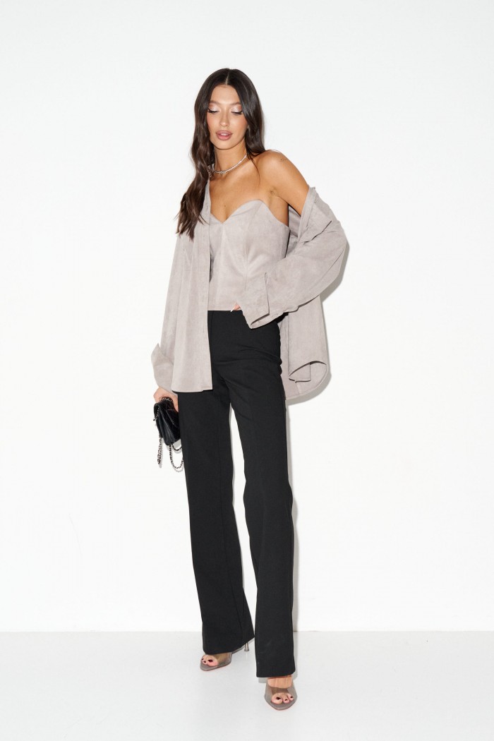 Корсет с фигурным вырезом выполнен из замшевой ткани. Характеристики: прилегающий силуэт, подкладка, фигурный вырез горловины, по передней части изделия и в боковых швах упругие узкие пластины, по заднему полотну замочек. Длина по спинке 25,5 см.