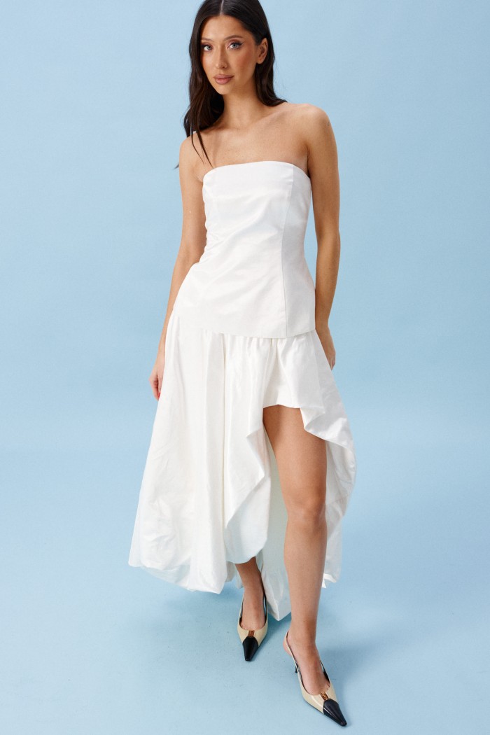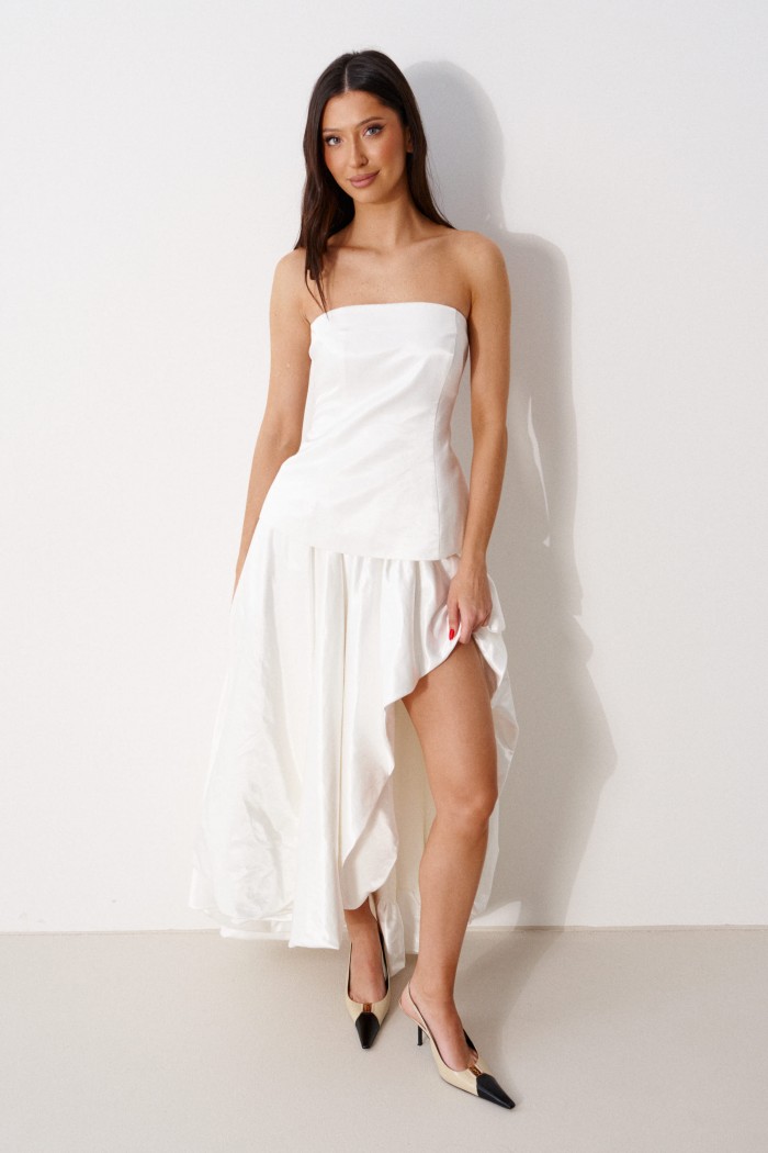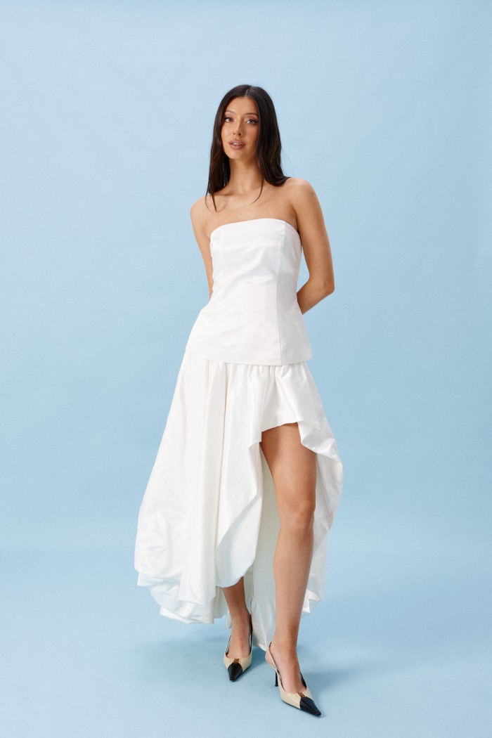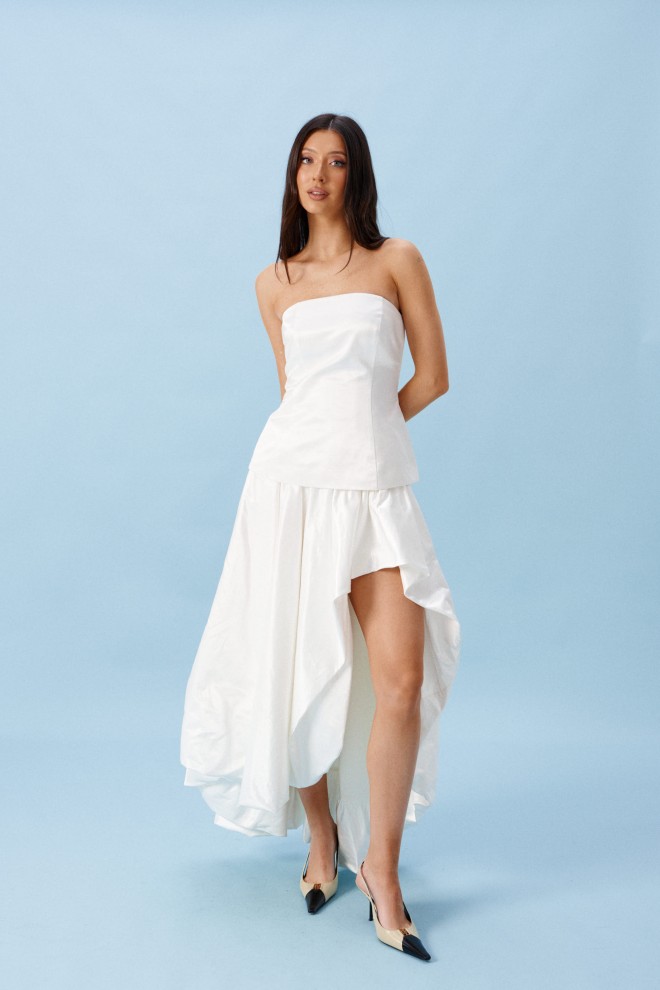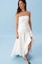 Корсет прилегающего силуэта из ткани белого цвета. Характеристики: прилегающий силуэт, подкладка, прямой вырез горловины, по передней и задней части изделия прошиты строчки, по заднему полотну в среднем шве потайная молния. Длина по центру спинки 37см, длина по боковому шву 37см.