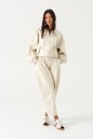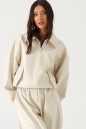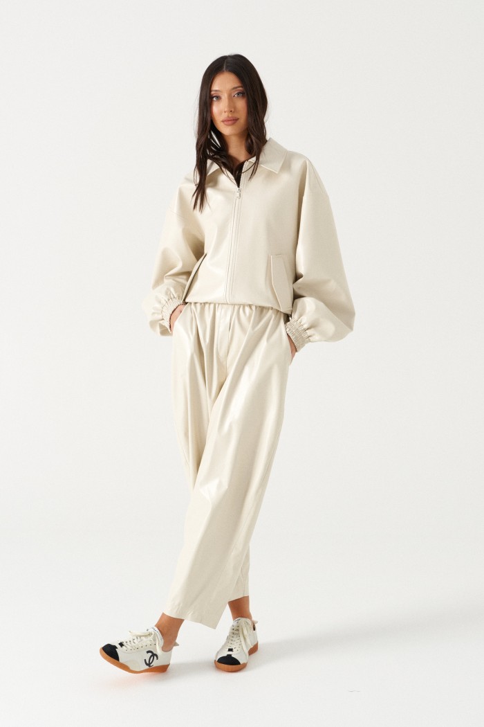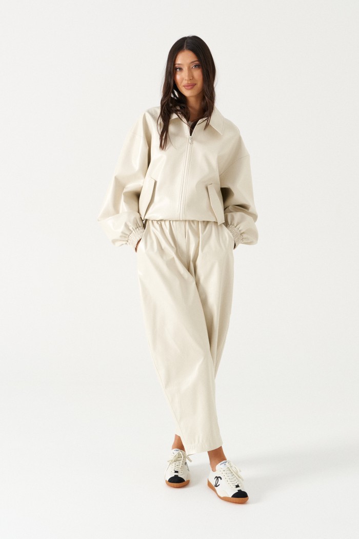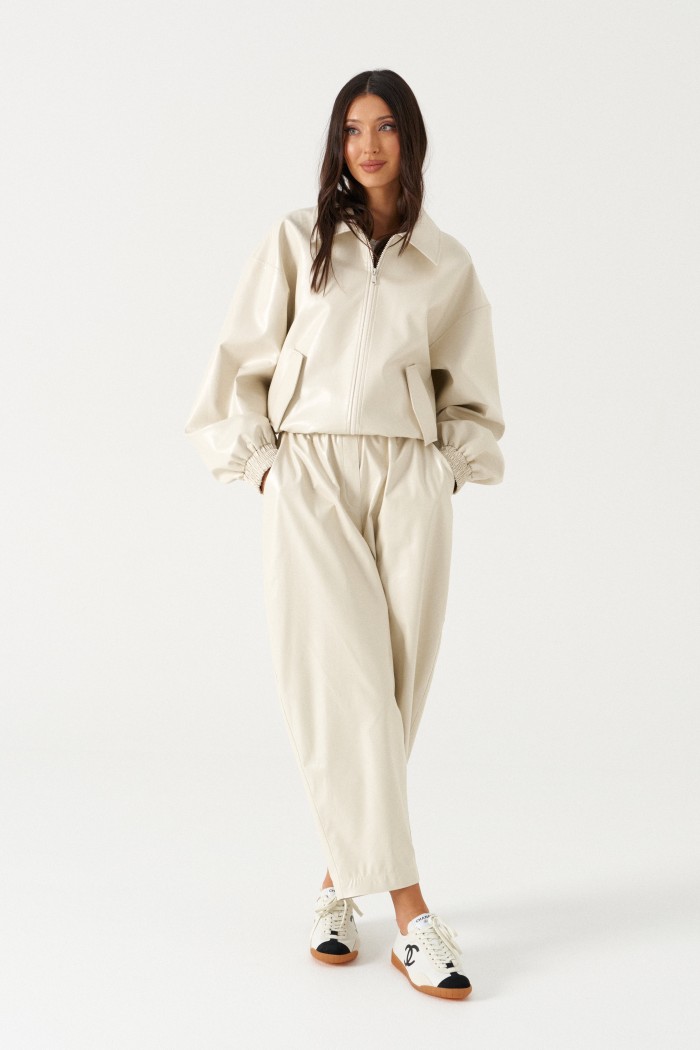 Куртка-бомбер свободного кроя. Выполнена из эко-кожи молочного (светло-бежевого) цвета. С подкладкой. Воротник отложной, горловина круглая. Рукав втачной, спущенный, с манжетом на резинке. Застёжка центральная - молния. Низ изделия на резинке. По переду внизу карманы с клапаном. Длина рукава от линии втачивания 59 см. Длина спинки 55 см.