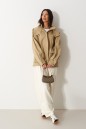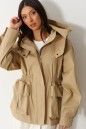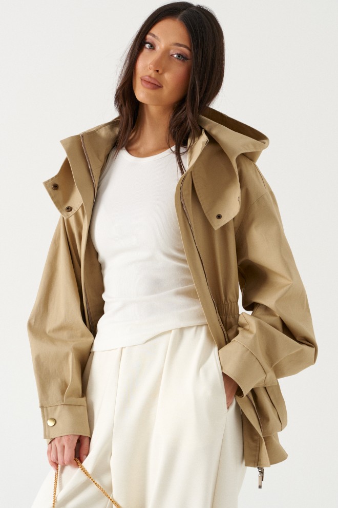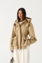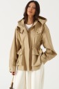 Куртка свободного кроя. Выполнена плотной хлопковой ткани коричневого цвета. С подкладкой. Воротник стойка. Застёжка центральная молния. Объёмный капюшон с застёжкой кнопками. Рукав втачной, спущенный, с манжетом, с кнопкой. Линия талии в изделии на резинке (не регулируемой). По переду внизу накладные карманы с клапаном. Длина рукава от линии втачивания 60 см. длина спинки 67 см