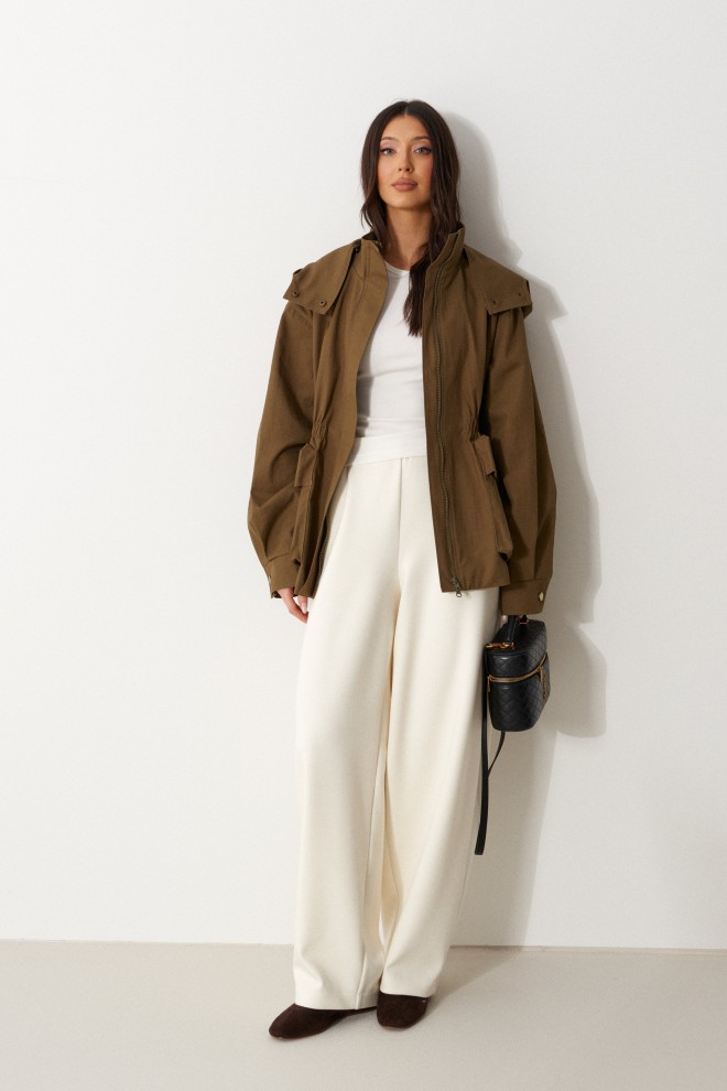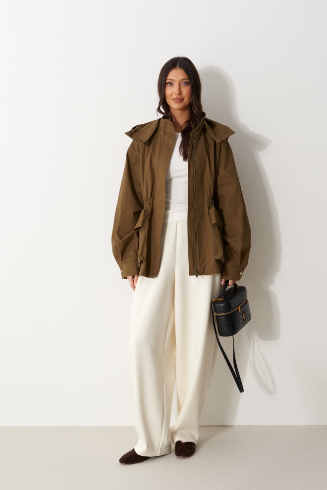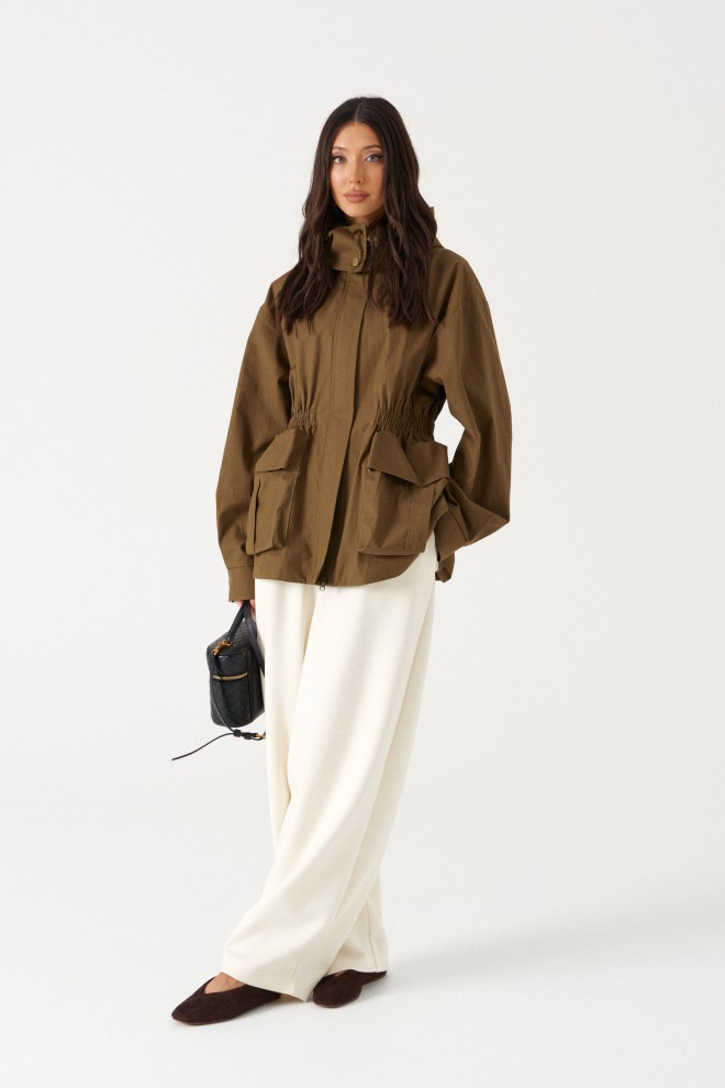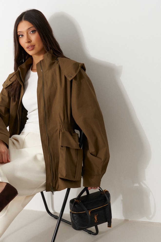 Куртка свободного кроя. Выполнена плотной хлопковой ткани коричневого цвета. С подкладкой. Воротник стойка. Застёжка центральная молния. Объёмный капюшон с застёжкой кнопками. Рукав втачной, спущенный, с манжетом, с кнопкой. Линия талии в изделии на резинке (не регулируемой). По переду внизу накладные карманы с клапаном. Длина рукава от линии втачивания 60 см. длина спинки 67 см