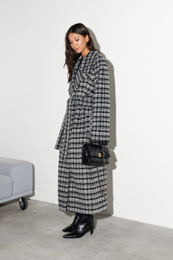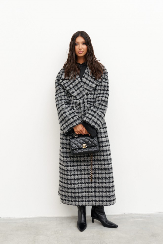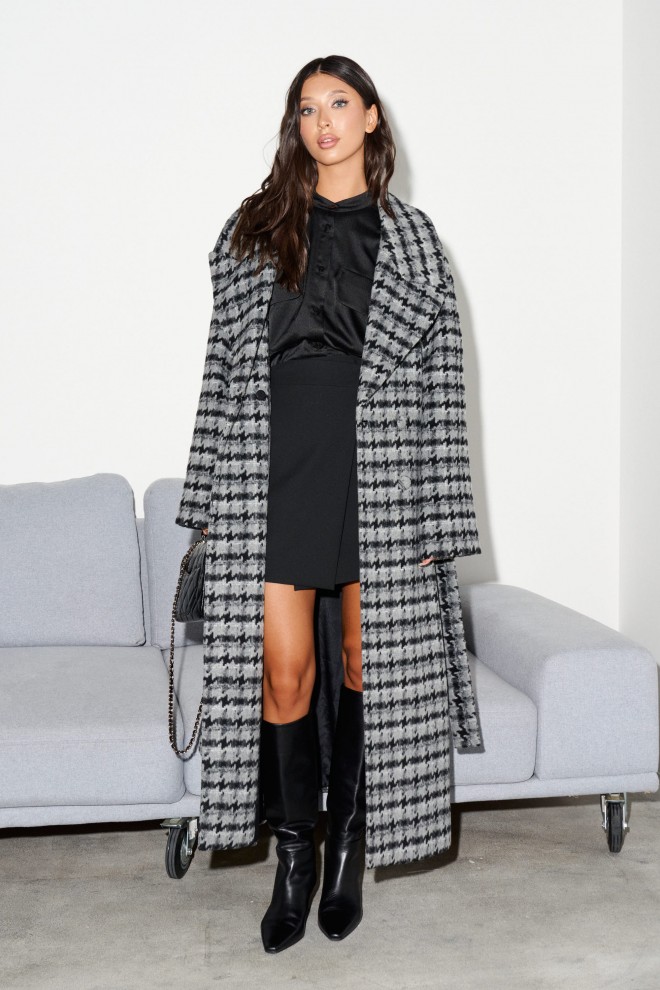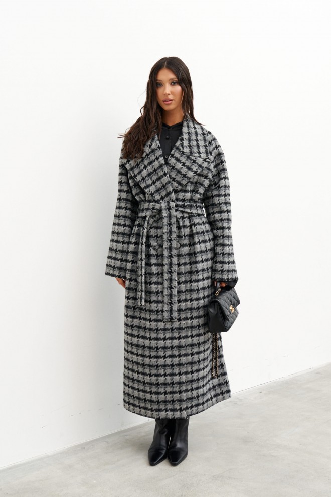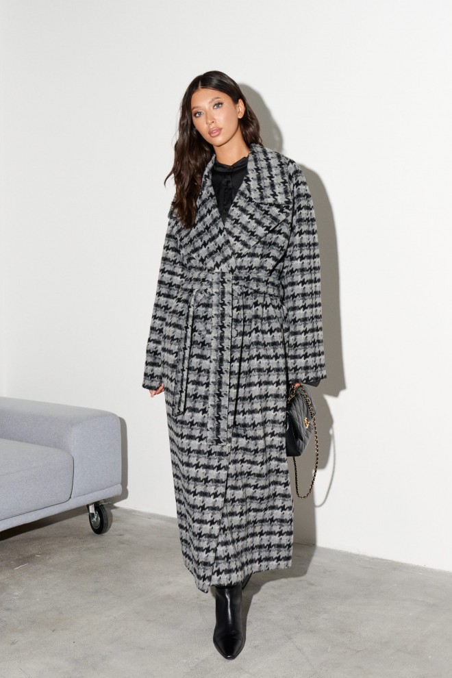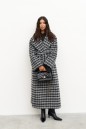 Пальто свободного кроя выполнено из фактурного полотна с принтом "Гусиная лапка". Характеристики: прямой крой, подкладка, крупный воротник с остроугольным лацканом, застежка двубортная на петлю пуговицу, рукав реглан, по переду прорезные карманы, по лини талии нашиты шлевки, в комплекте пояс из ткани основного изделия, спинка со средним швом, по низу шва разрез 47 см. Длина по спинке 121 см, длина рукава 47 см.