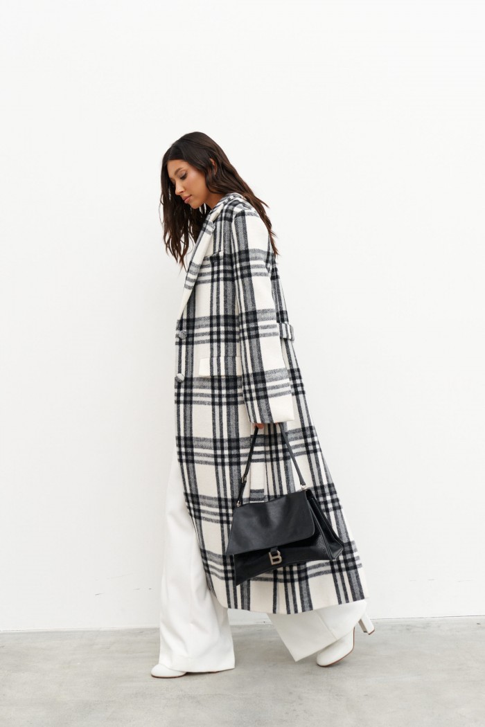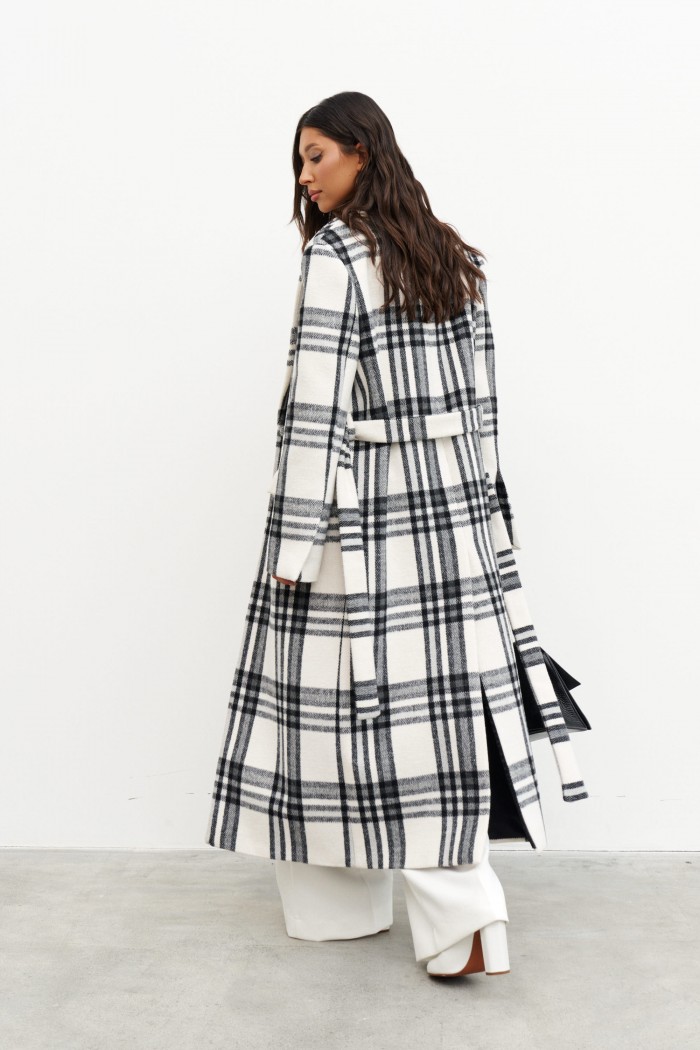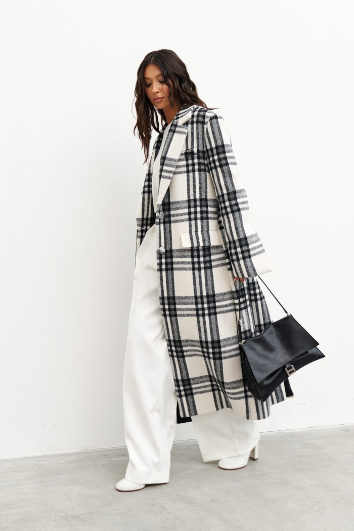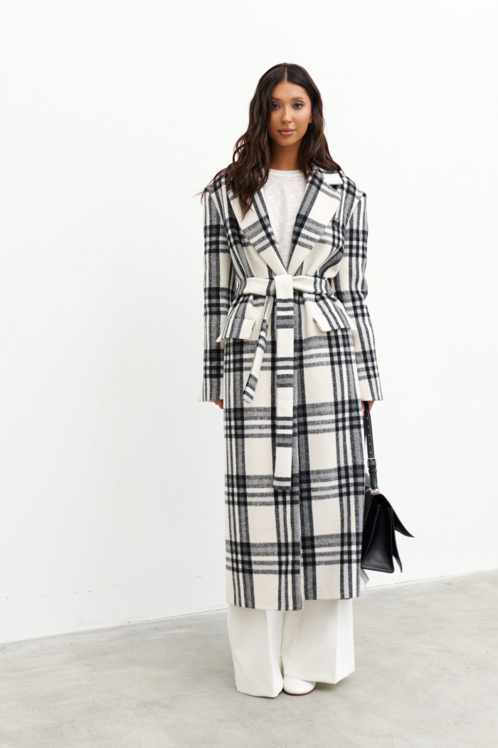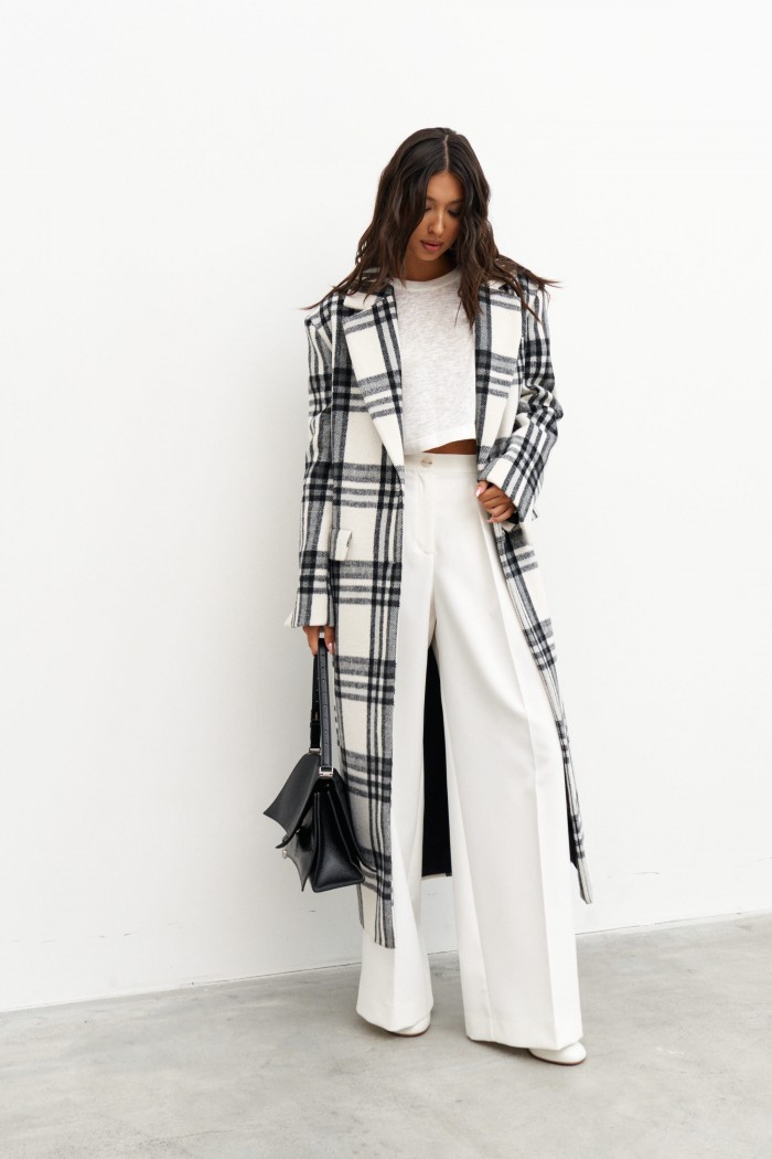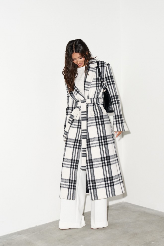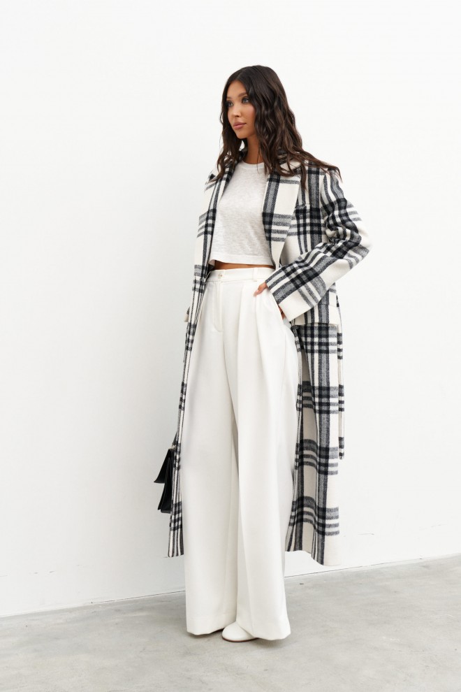 Пальто прямого кроя, выполнено их фактурного полотна молочного цвета с черной клеткой. Характеристики: покладка, подплечники, отложной воротник с остроугольным лацканом, застежка центральная на две петли пуговицы, по линии талии шлевки, в комплекте пояс из ткани основного изделия, рукав втачной, по переду прорезные карманы с клапаном нашиты мелкие пуговицы, в среднем шве заднего полотна изделия разрез 58 см. Длина изделия 131 см, длина рукава 64 см.