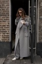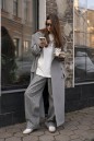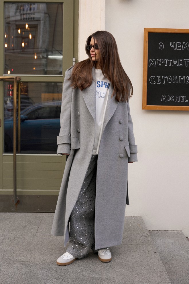 Пальто двубортное. Выполнено из пальтовой ворсовой ткани серого цвета. Есть подклад. Воротник отложной с широкими лацканами. Застежка центральная на петли пуговицы (обтянуты тканью основного изделия). Рукав втачной, немного спущен, есть подплечники, по низу рукава пата с пуговицей. Длина рукава 61 см. По линии плеча погон с пуговицей. Карман листочка с клапаном. В комплекте пояс из ткани основного изделия. По центру спинки шлица 59 см. Длина спинки 128 см.