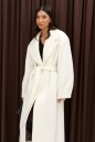 Полупальто прямого кроя выполнено из фактурного полотна молочного цвета. Характеристики: есть подклад, рукав втачной, воротник пиджачного типа, в боковых швах карманы. Спинка со средним швом заканчивается шлицей, застёжка центральная на петли и пуговицы, пояс выполнен из основной ткани изделия.
