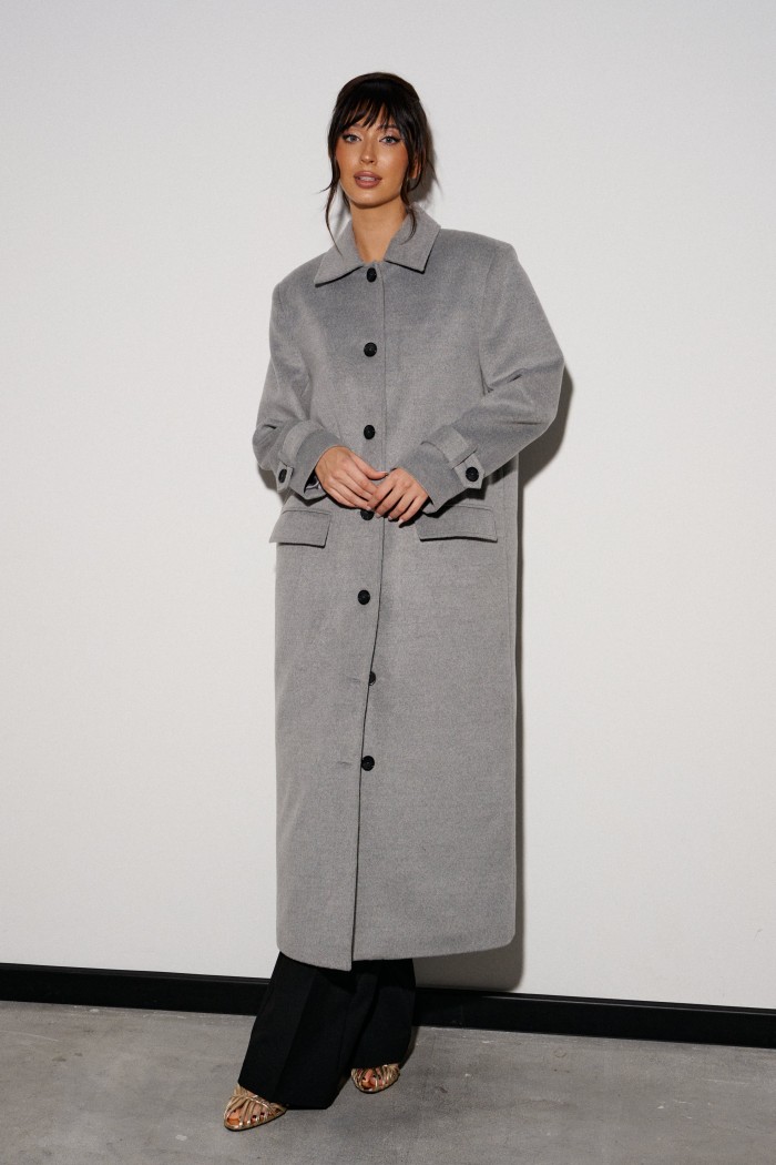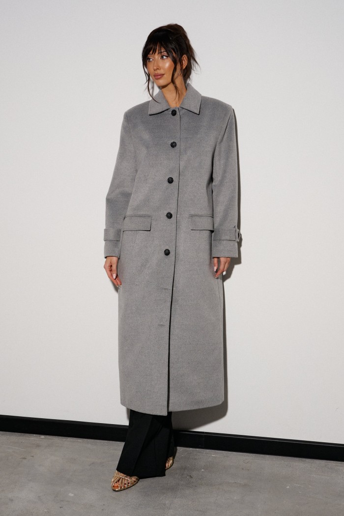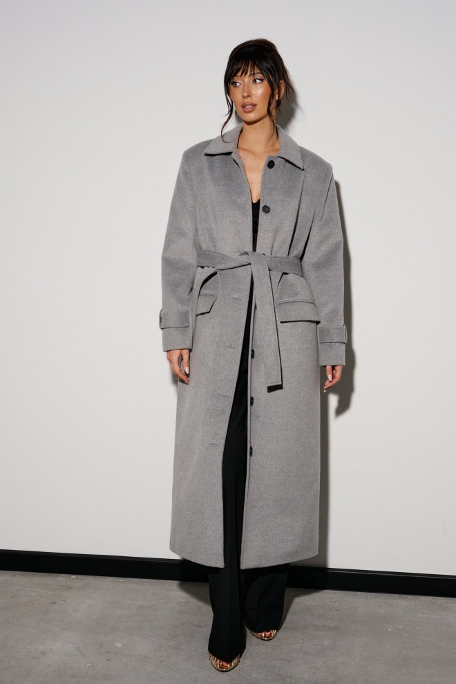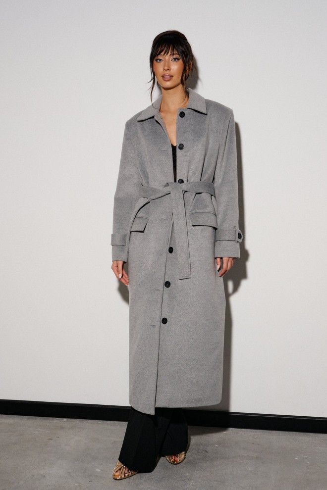 Пальто прямого свободного кроя, выполнено из могкого серого полотна. Характеристики: отложной воротник, застежка центральная на петли - пуговицы. Подкладка с утеплением, подплечники. Рукав втачной, по низу рукава пата с пуговицей. В комплекте идет пояс из основной ткани изделия. По переду карманы с клапаном. В среднем шве спинки шлица 54см. Длина изделия 125 см, длина рукава от края горловины 79.5 см.