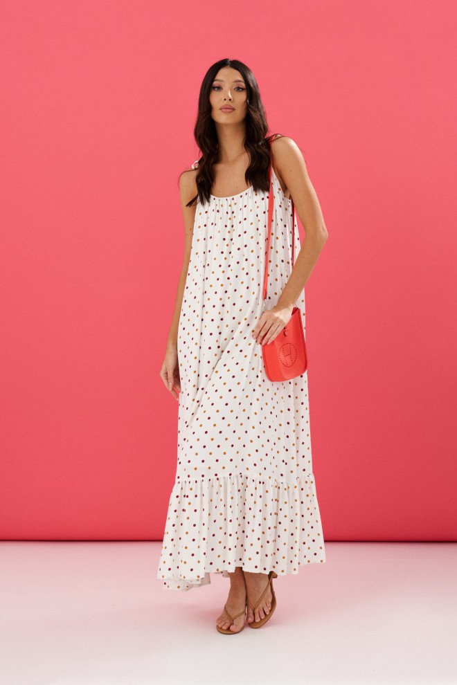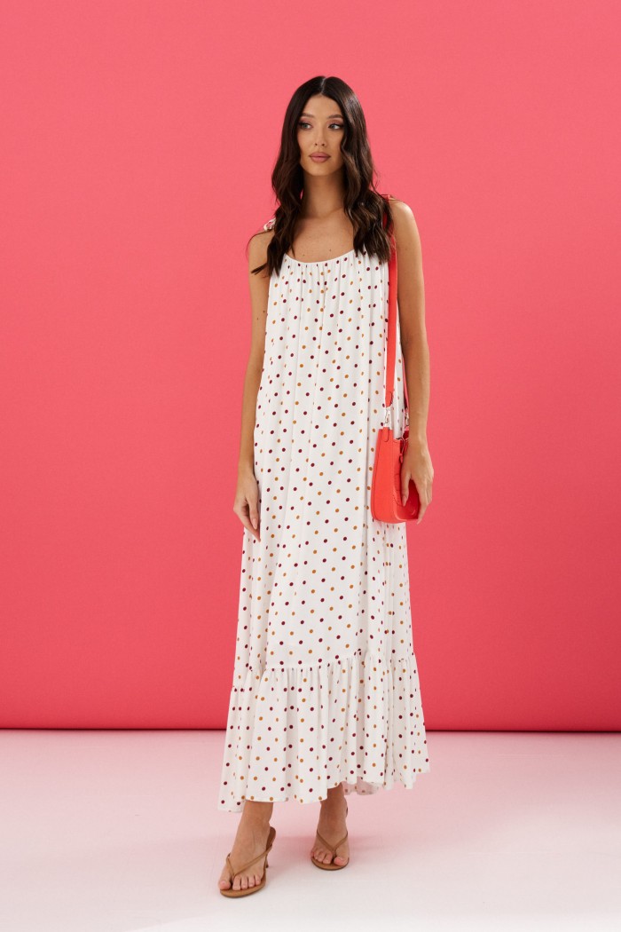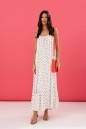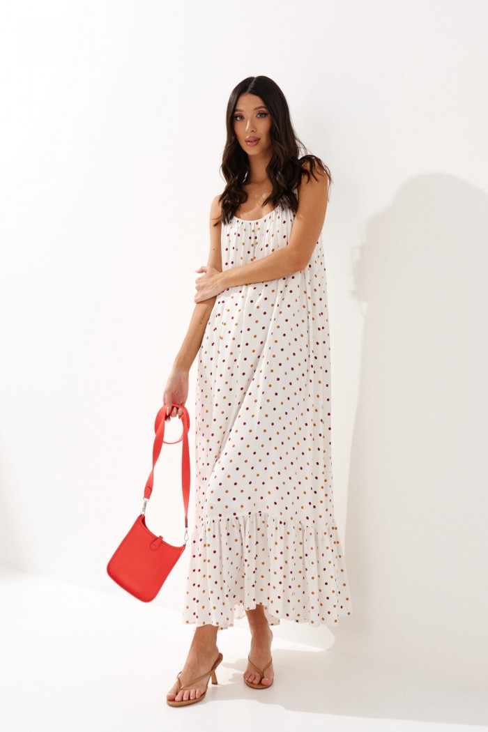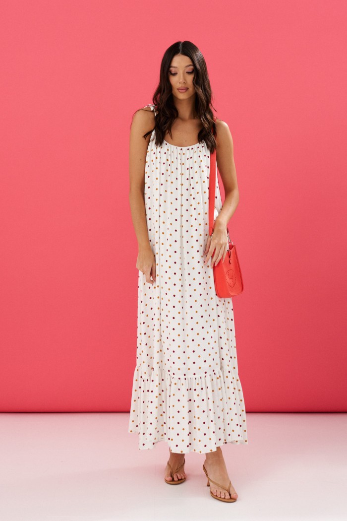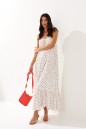 Платье на бретелях выполнено из натурального полотна белого цвета в мелкий горох.