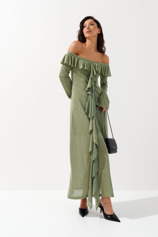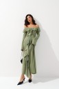 Платье полуприлегающего силуэта выполнено из полупрозрачной трикотажной ткани цвета хаки.