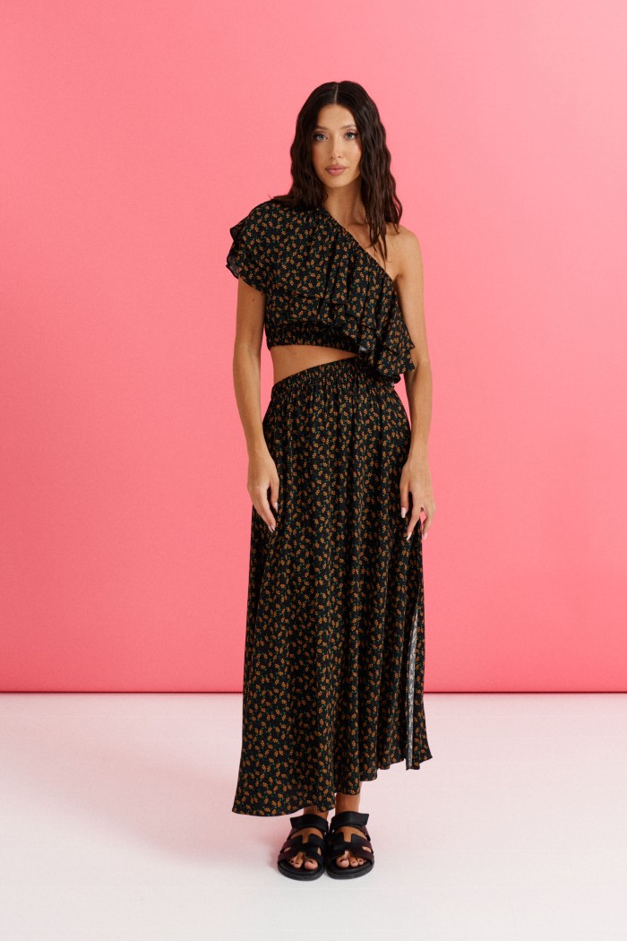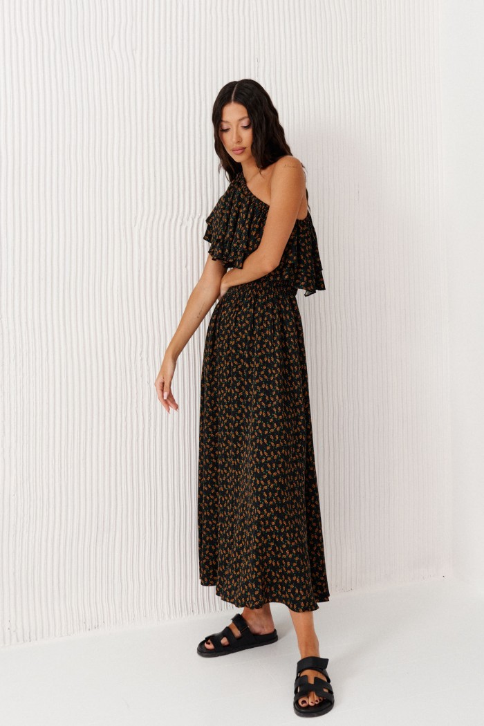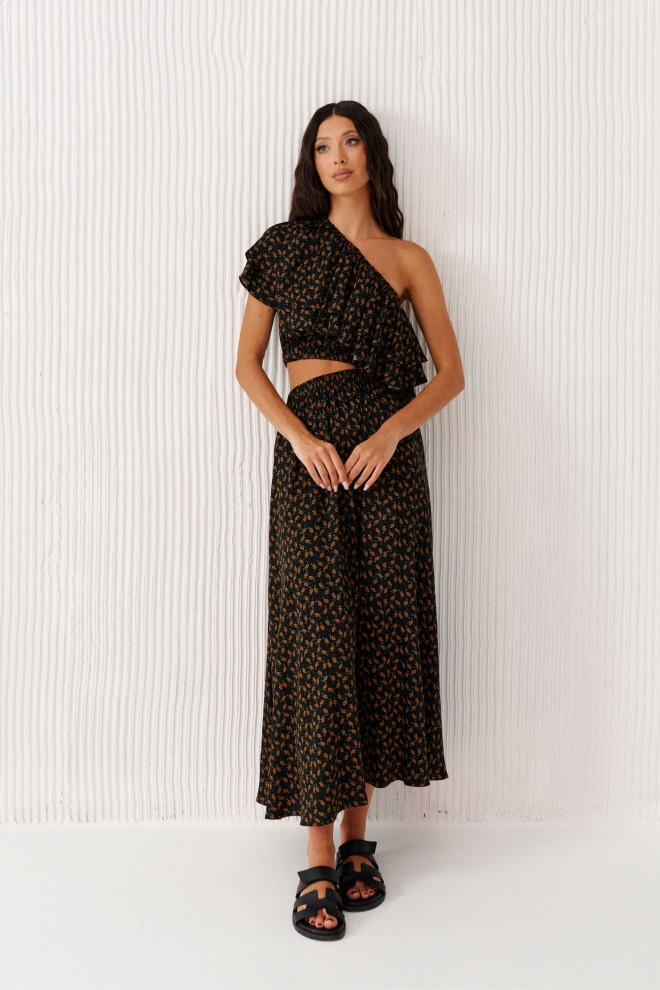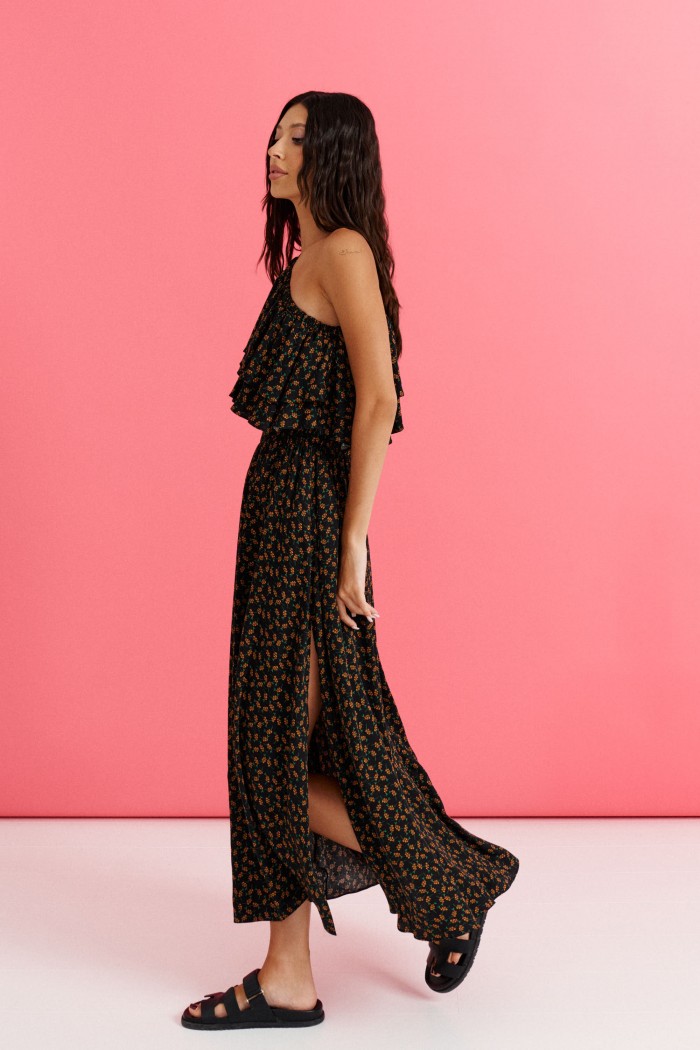 Платье с открытым плечом выполнено из полотна с цветочным принтом.