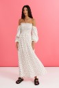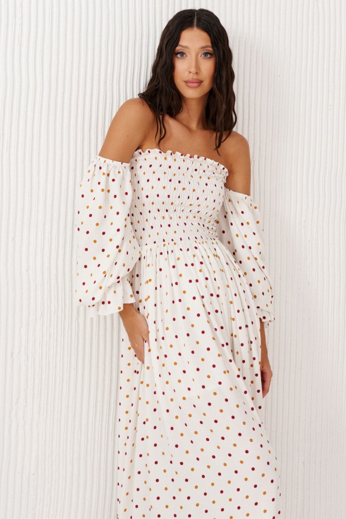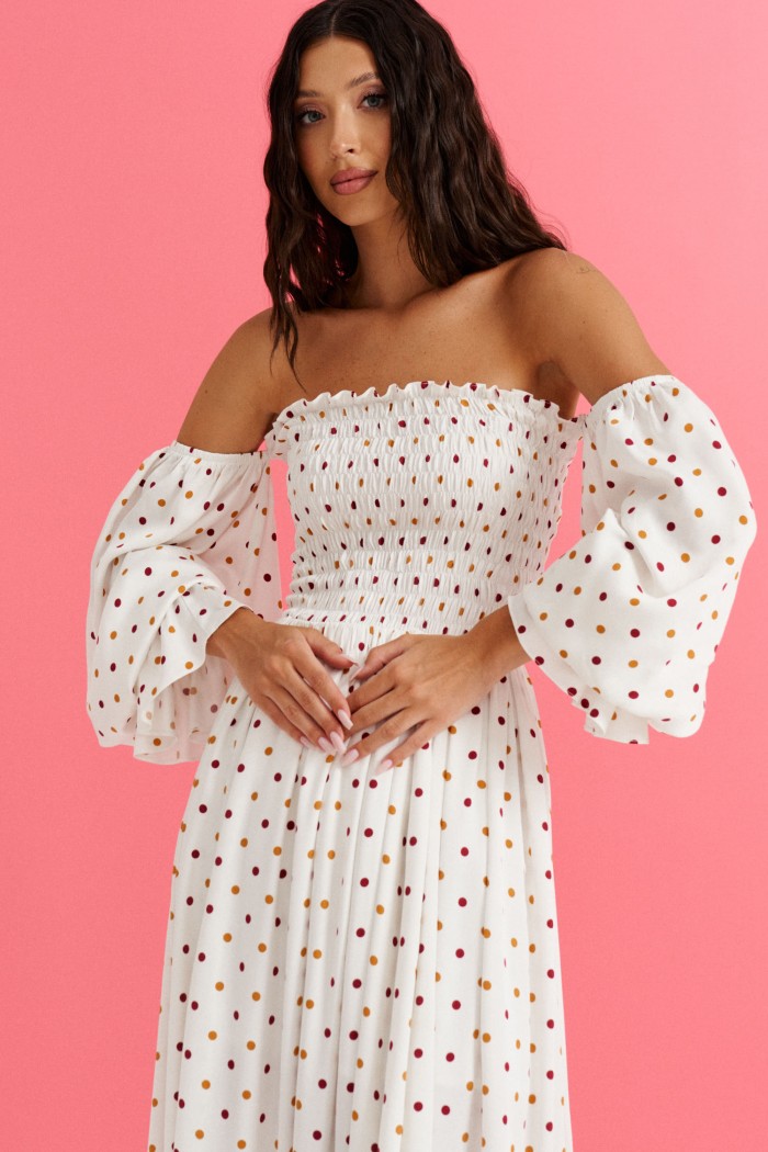 Платье с открытыми плечами выполнено из белого полотна с принтом горох.