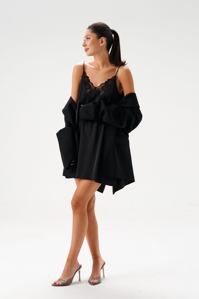 Платье-мини на бретелях. Выполнено из сатиновой ткани. Бретели регулируемые. Лиф отрезной фигурный с кружевом. Лиф двойной. В юбке платья есть подклад. Спинка открытая, с круглым вырезом. Длина по центру спинки 42 см, длина по боковому шву 59 см