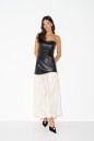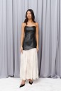 Платье выполнено из черной эко-кожи и молочного кружева. Характеристики: верх корсетного типа, на подкладке, спереди и сзади изделия отстрочка по линиям, юбка выполнена из кружева, сзади по центру потайная молния. Длина изделия 122 см.