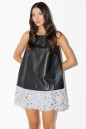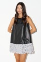Платье выполнено из полотна эко-кожи черного цвета. Характеристики: крой свободный трапеция, горловина овальная, по низу изделия планка выполненая из ворсистого полотна с пайетками в сером цвете, застежка потайная тесьма молния в среднем шве заднего полотна изделия. Длина по спинке от края горловины 77 см.