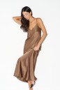 Платье на бретелях, полуприлегающего силуэта. Выполнено из сатиновой ткани бежевого цвета. Характеристики: полуприлегающий силуэт, регулируемые бретели, лиф фигурный с вытачками по переду, . Длина по спинке 114см.