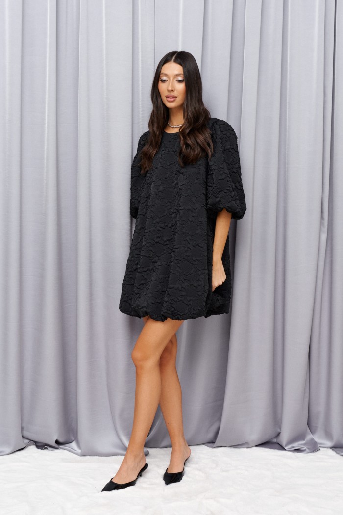 Платье свободного кроя выполнено из черного фактурного полотна. Характеристики: свободной крой, А-силуэт, подкладка, овальная горловина, низ изделия воланом, застежка петля-пуговица на спинке изделия, рукав обьемный, по низу рукава резинка - волан. Длина по спинке 81см, длина рукава от края горловины 52см.