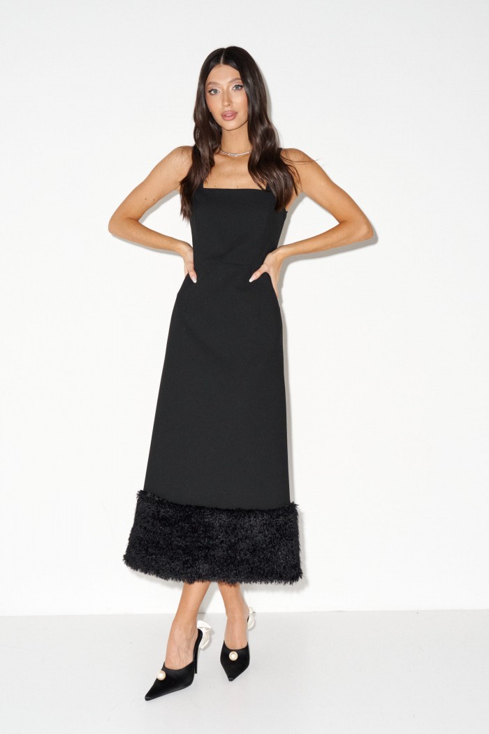 Платье-миди прилегающего силуэта. Выполнено из текстиля чёрного цвета. Отрезное по линии талии. Вырез-декольте глубокий квадратный. Спинка закрытая. По низу декорировано эко-мехом в чёрном цвете. Застежка потайная молния в среднем шве заднего полотна изделия. В юбке изделия в среднем шве заднего полотна разрез 22 см. Длина спинки 124 см