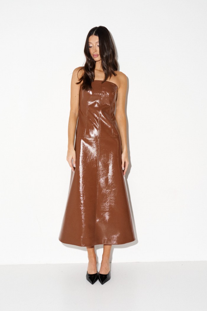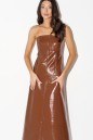 Платье приталенное А-силуэта с открытыми плечами выполнено из лакированной эко-кожи. Характеристики: А- силуэт, открытые плечи, верх изделия - имитация корсета, застежка потайная тесьма молния в среднем шве заднего полотна изделия. Длина по спинке 109 см.