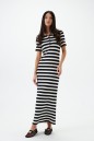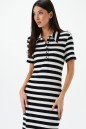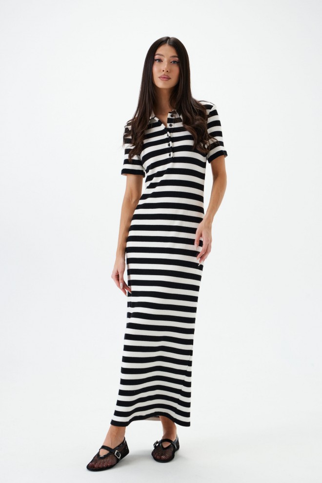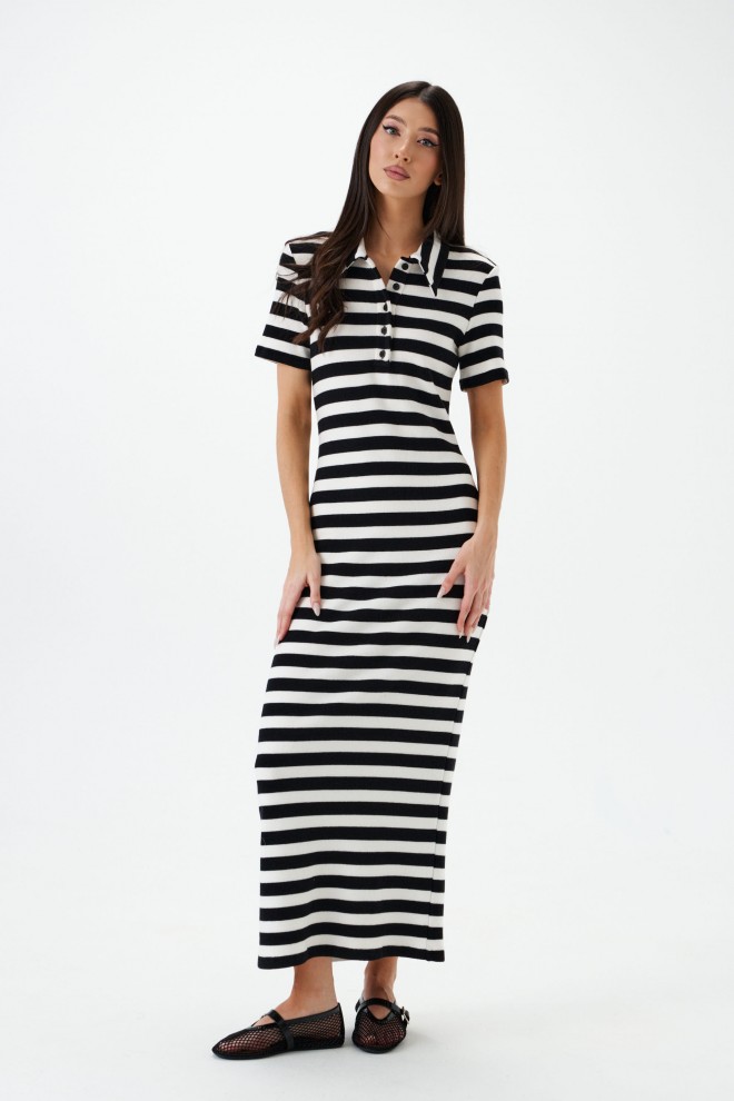 Платье-макси. Выполнено из трикотажного полотна. Прямой крой. Воротник-поло, отложной. Застёжка – пуговички. Рукав втачной. Длина рукава от линии втачивания 22 см. Длина спинки 137 см