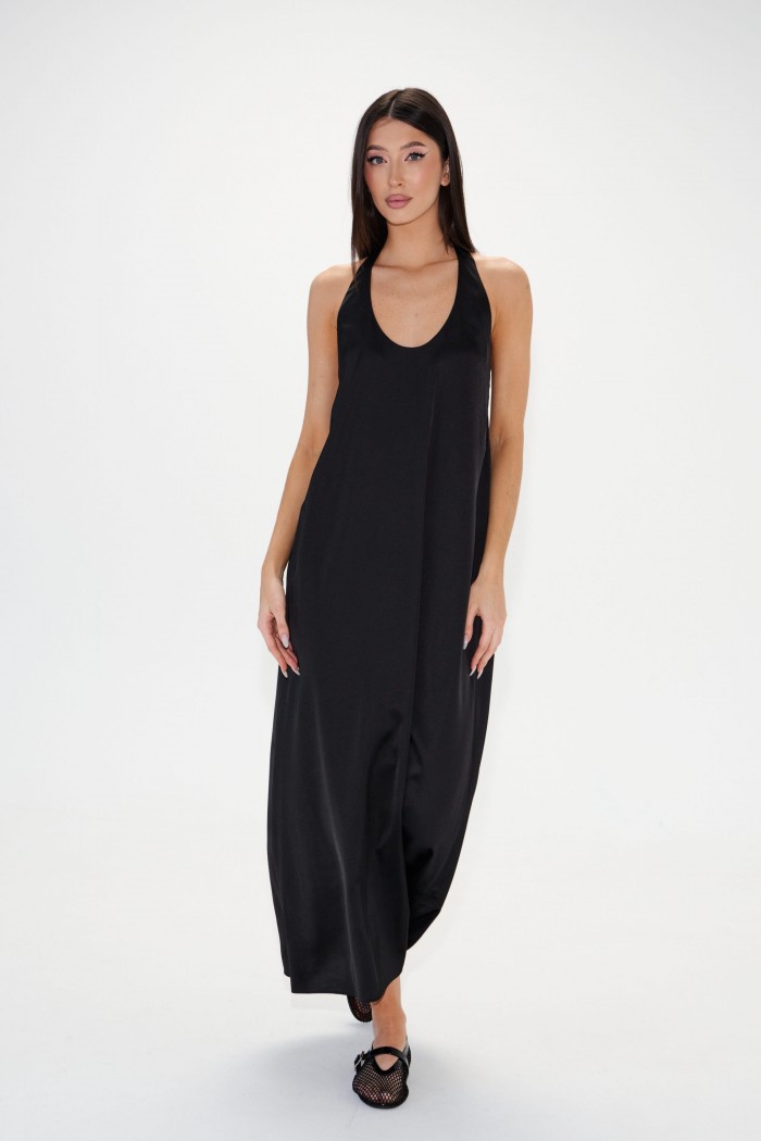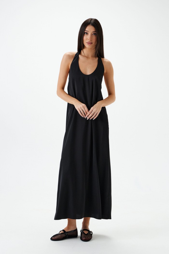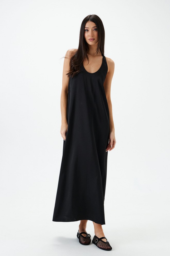 Платье полуоблегающегоо силуэта выполнено из черного полотна. Характеристики: полуоблегающий силуэт, расширенное к низу, цельнокраеная бритель через шею, спинка по верху присборена на резинку. Длина по боковому шву 110 см.