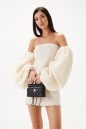 Платье прилегающего силуэта. Выполнено из текстильного полотна "гофре". Открытые плечи. Рукава-буфы съёмные, по всей внутренней стороне со сборкой. Длина рукава 66 см. Длина платья по боковому шву 60 см