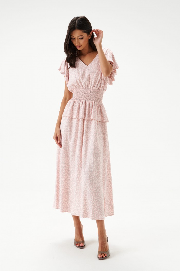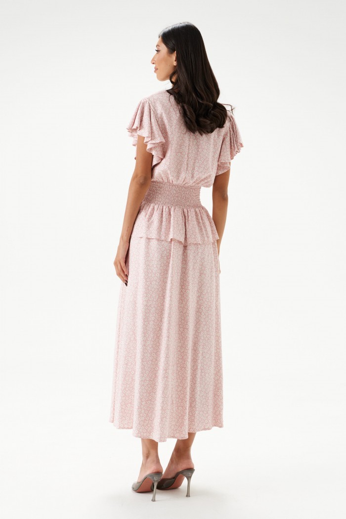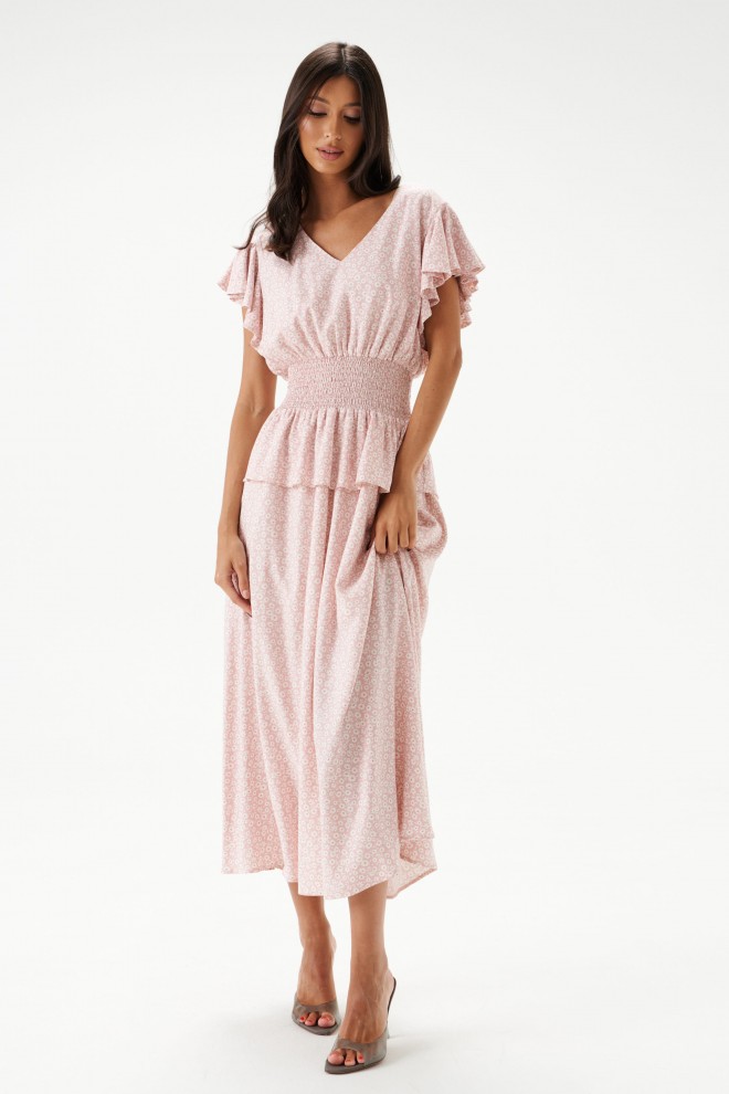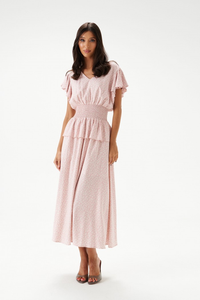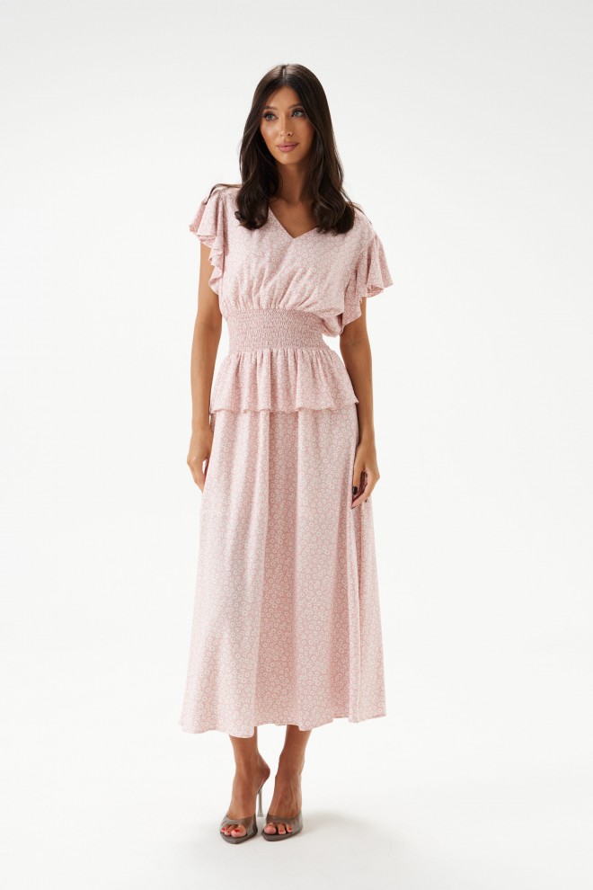 Платье-макси. Выполнено из мягкой струящейся ткани нежно-розового цвета с цветочным принтом. С подкладкой. Вырез горловины V-образный. Рукав-волан втачной. Спинка закрытая. Пояс – венгерка. От пояса баска-волан. Юбка свободного кроя, с подкладкой. Платье без застёжки. Длина платья 129 см