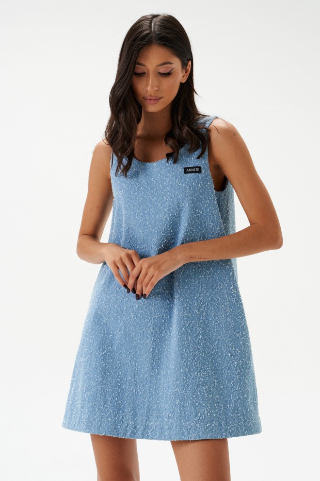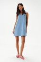 Платье в крое - трапеция, выполнено из джинса с эффектом потретости. Горловина овальная. В боковых швах потайные карманы. По центру спинки расположен шов.Длина по спинке 76 см