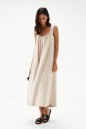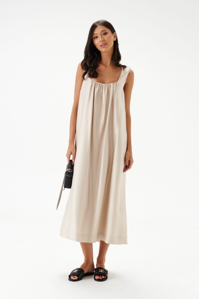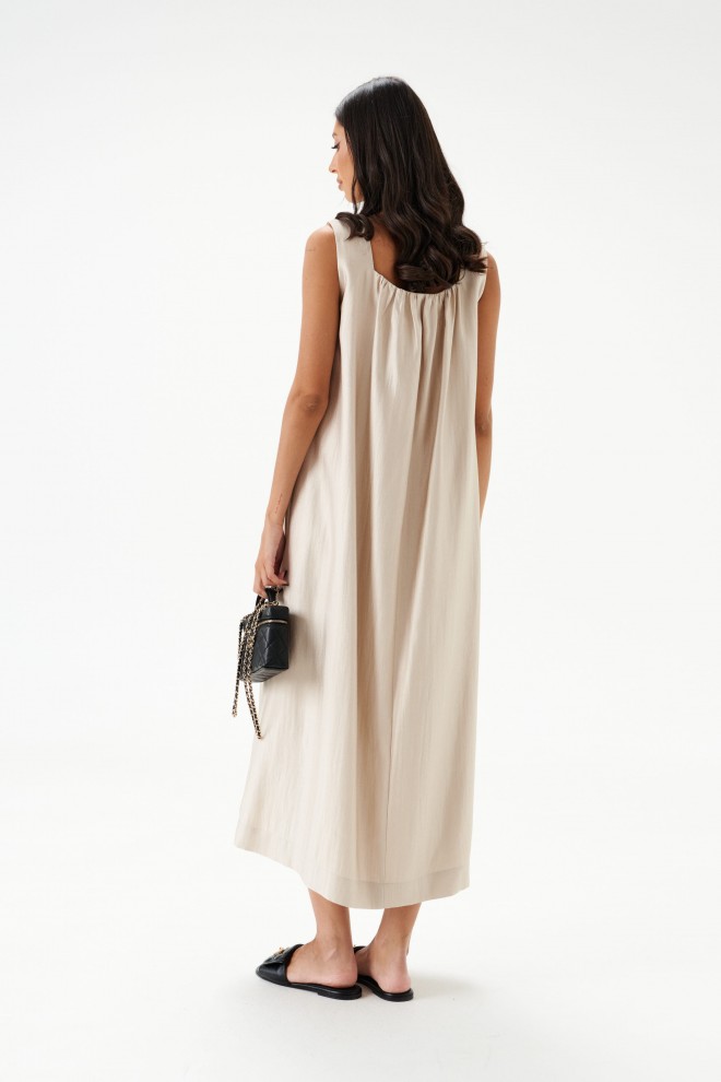 Платье А-силуэта, выполнено из трикотажного полотна песочного цвета с перламутровым отливом. Без подкладки. Квадратный вырез горловины присборен. В боковых швах карманы-хулиганы. Длина по спинке 114 см