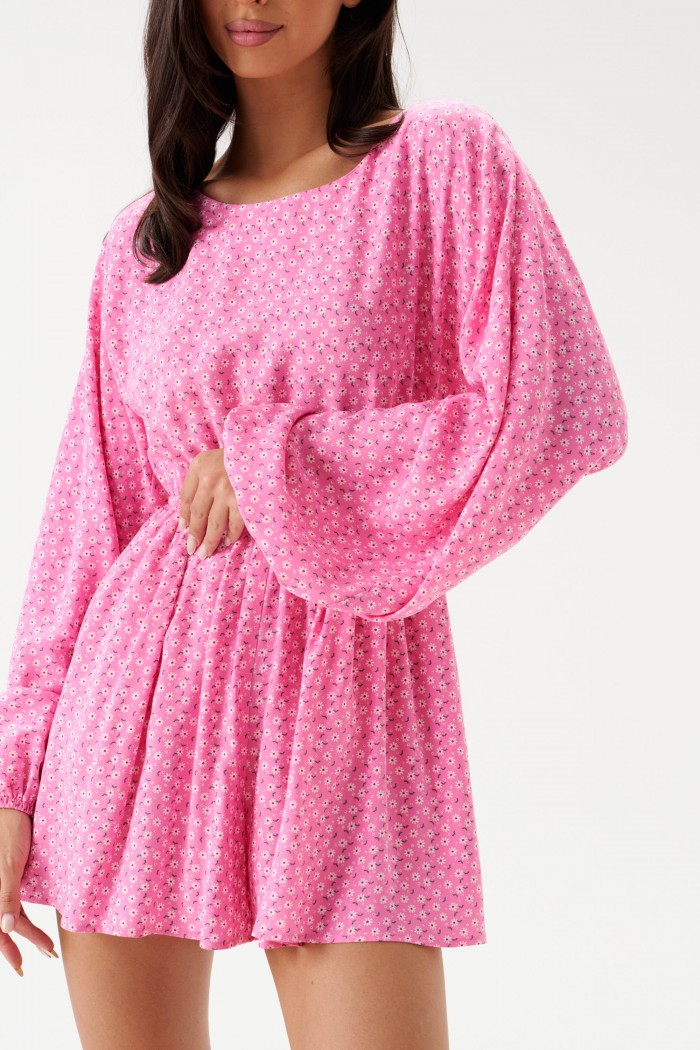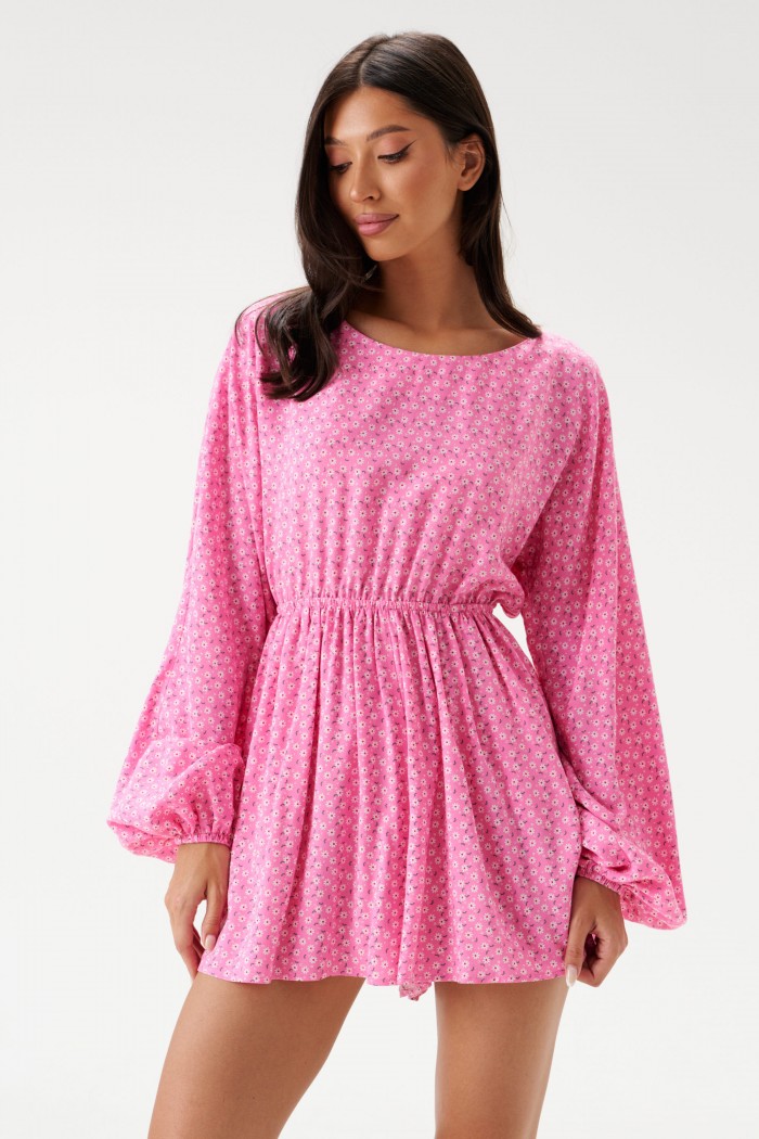 Комбинезон - мини полуприлегающего силуэта выполнено из розового полотна с белым цветочным принтом. Горловина овальная. Отрез ниже талии на резинке. По лифу спинки вырез с завязками. Рукав спущенный, присборен на резинку. Длина платья 84 см, длина рукава от горловины 76 см.