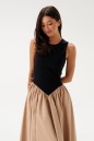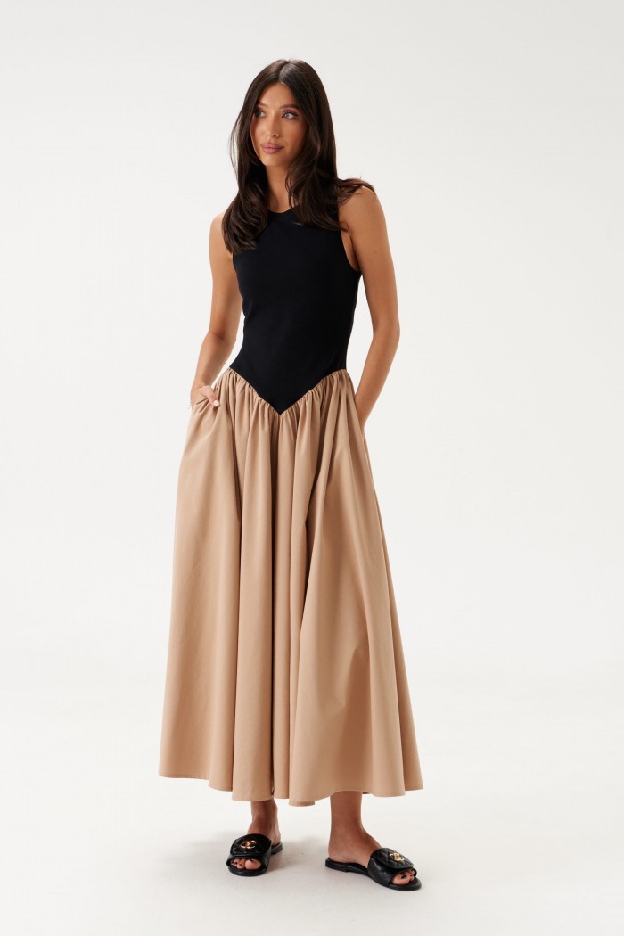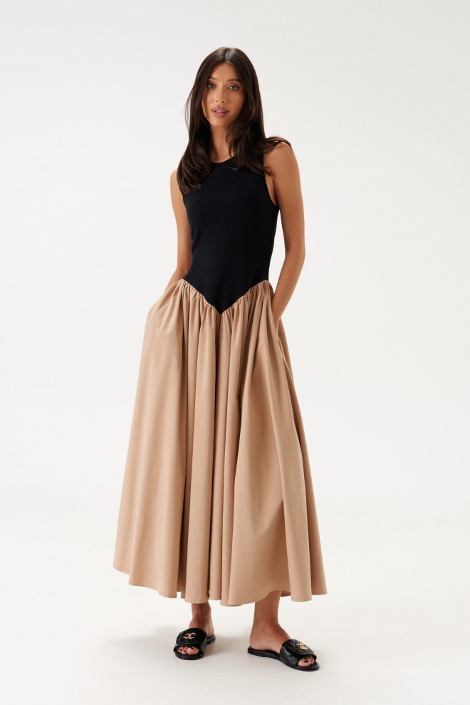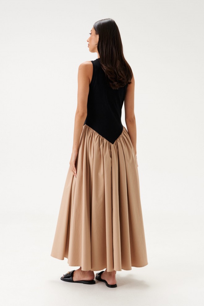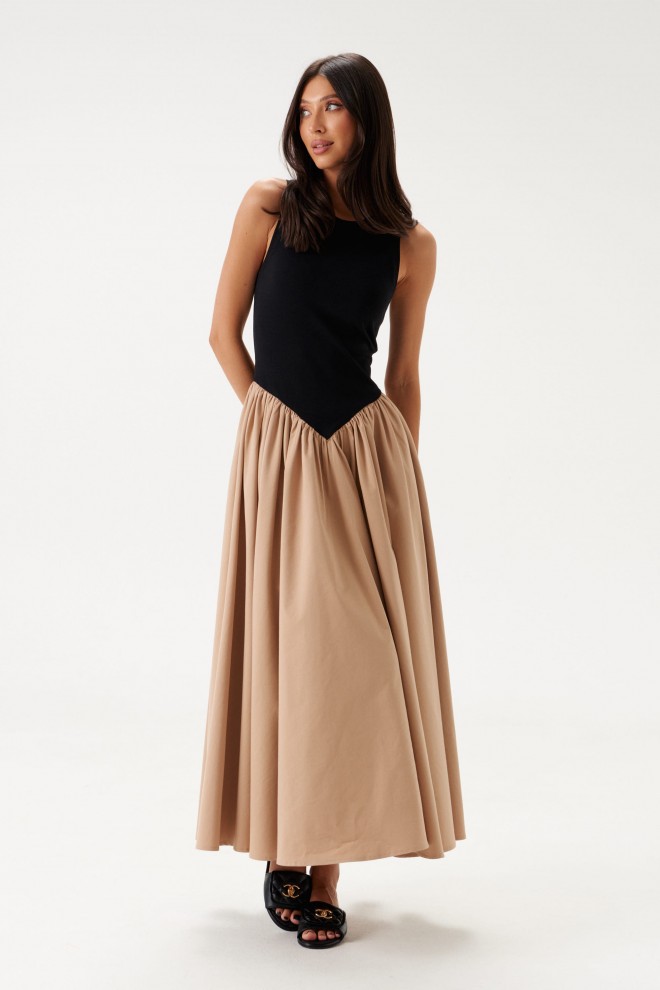 Характеристики: полуприлегающий силуэт, отрезное, отрез фигурный, горловина овальная, верх изделия выполнен из трикотажной ткани черно цвета, низ изделия без подкладки, с частой сборкой, что придает юбке объем, выполнен из полотна кофейного цвета, в боковых швах карманы. Длина по спинке 131 см.