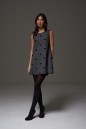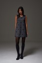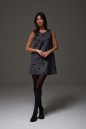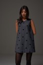 Платье прямого кроя, без рукавов. Выполнено из костюмной ткани серого цвета, декорированной черными сердечками. Характеристики: прямой крой, горловина овальная, черная брендированная подкладка, застежка потайная тесьма молния в среднем шве заднего полотна изделия. Длина по спинке 79 см.