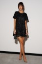 Платье свободного силуэта. Выполнено из фактурного ворсистого полотна с пайетками в черном цвете. Горловина овальная, рукав втачной, застежка на петлю пуговичку на спинке, рукав втачной, есть подкладка. Длина спинки 80 см, длина рукава 21 см
