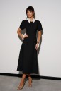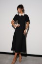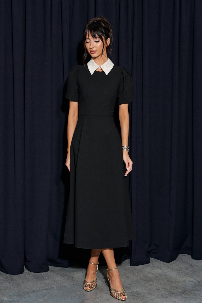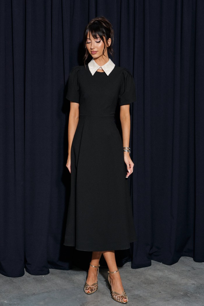 Платье-миди прилегающего силуэта со свободной юбкой. Выполнено из плательной ткани черного цвета. С подкладкой. Декорировано контрастным воротничком с кружевом (съёмный). Вырез горловины круглый. Рукав втачной, со сборкой. Застёжка - молния в среднем шве заднего полотна. По линии талии отрез. Длина рукава 24 см. Длина спинки 119 см