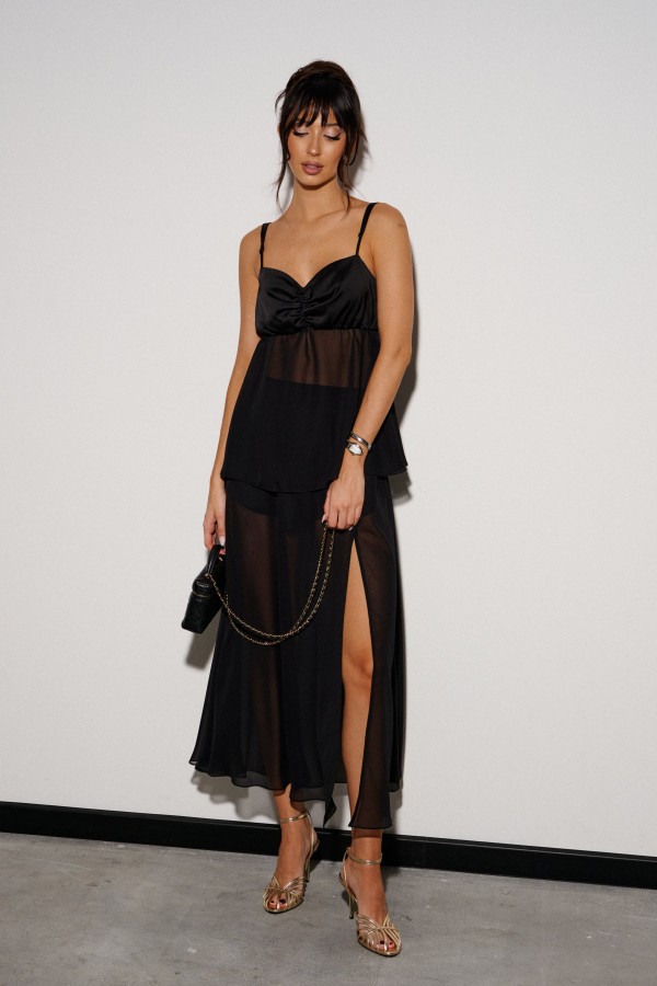 Платье-мини выполнено из трикотажного полотна чёрного цвета. Характеристики: широкие нерегулируемые боетели, низ с фигурным срезом, заканчивающийся воланом, сзади потайная застежка-молния. Длина спинки 64 см, длина по боковому шву 57 см.